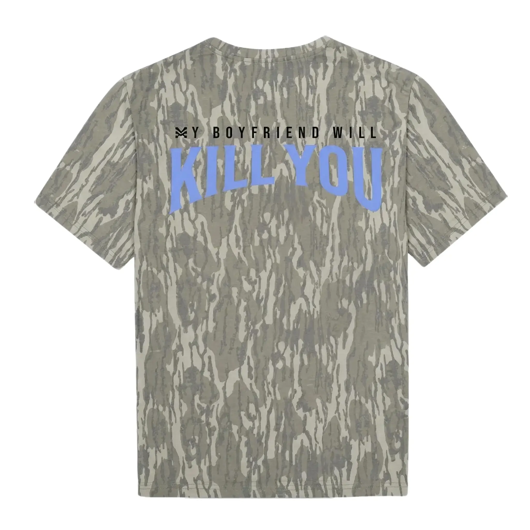 Funny Slogan Camo Tee, Edgy Streetwear Graphic Shirt, Mossy Oak Pattern T-Shirt, My Boyfriend Will Kill You Camo Tee, Unique Graphic Print Top
