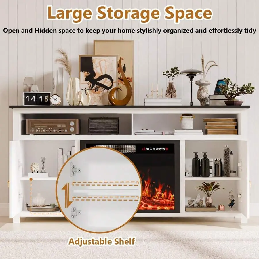 Large and Flexible Storage:Two 14.4"*26.4" open compartments above the cabinets are convenient for your speakers, cd player and other equipment.Both storage cabinets with doors have a removable and adjustable divider to store your various sizes of items, making your space more neat and organized.58inch desktop used for TVs up to 65inch