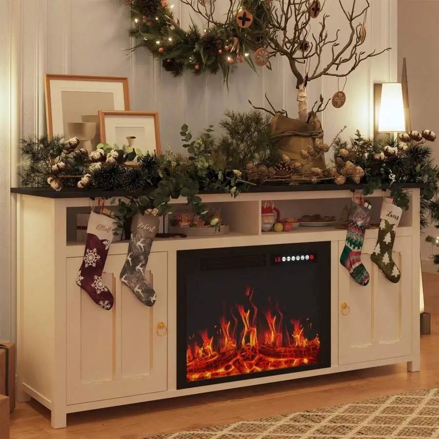 Sturdy and Durable:This fireplace entertainment center is made of high quality and durable particle board, good structural design, 0.6 inch thick table top and sturdy wood support base ensures that this media console has excellent stability, durability, and this TV stand can hold up to 110 lbs.