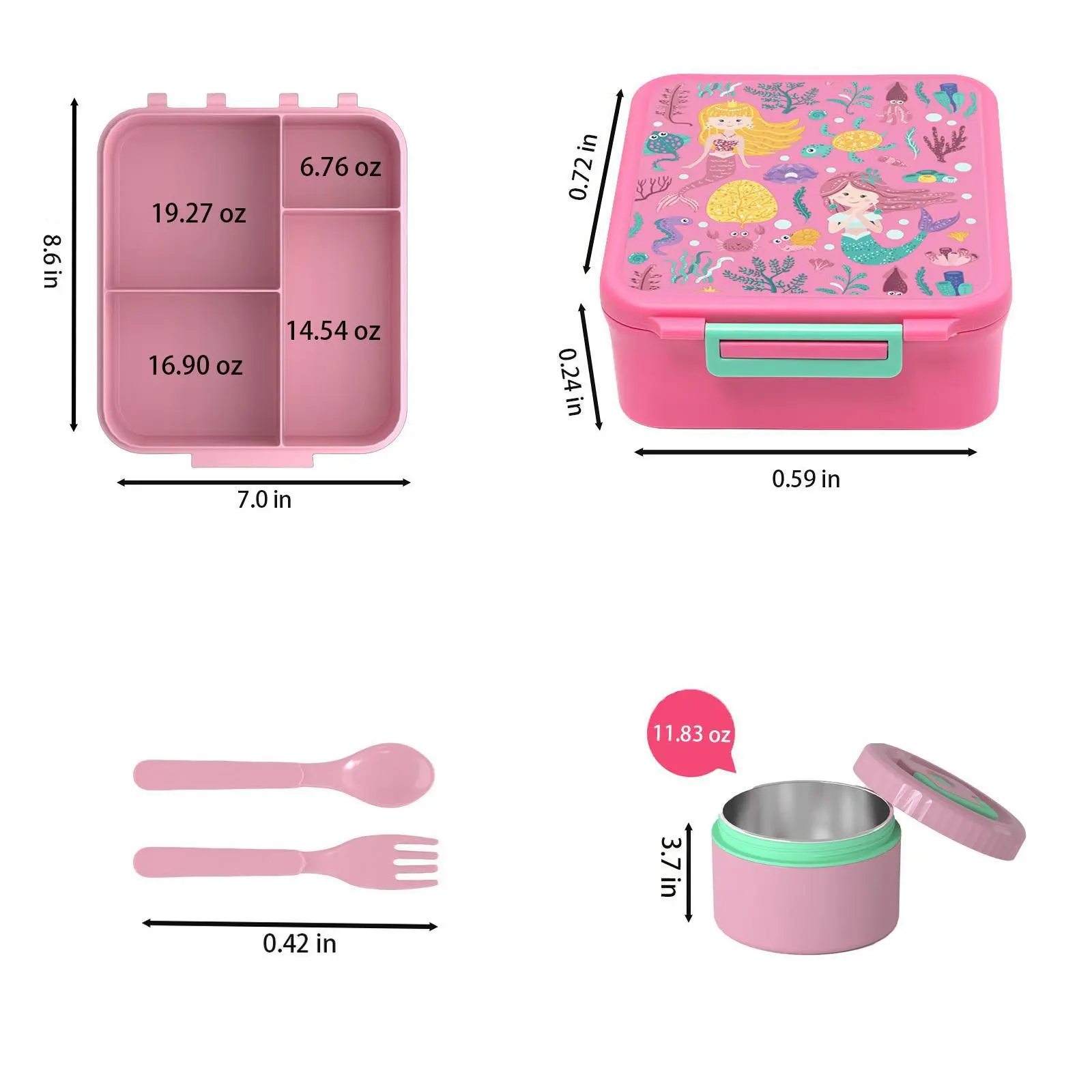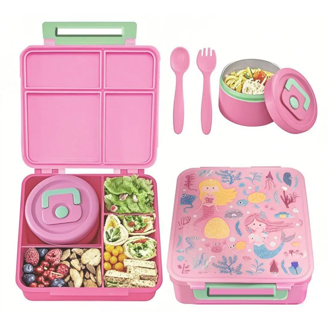 Bento Lunch Box with 8oz Soup Thermos 4 Compartment Insulated Hot Food Jar for Kids Non BPA Leakproof Lunch Containers Mermaid Design Portable Reusable School Travel Picnic Food Container Set