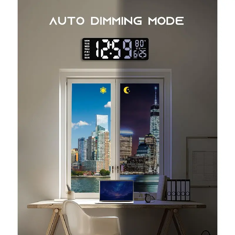 16. 5 Inch Display: With its large 16. 5 in screen, this RGB digital wall clock makes checking the time effortless from anywhere in the room. The large numbers are easy to read from any angle and distance, especially user friendly for the elderlyRGB Dynamic Ambient Light: Choose from eleven eye-catching RGB colors and adjust the brightness to perfectly suit your mood and room. EASYERA digital wall clock turn your gaming room into an immersive haven and helping you unwindBT Auto Synct: Daily phone connection ensures accurate time, hands-free and hassle-freeDo both for Wall Mounted and Desktop: Our digital wall clock can be easily mounted on the wall or placed on a desk. Whether you're looking to save space or add a stylish touch to your desk, this feature provides flexibility and convenienceAuto DST Adjustment: Enjoy hassle-free timekeeping with automatic Daylight Saving Time (DST) adjustment, ensuring you're always on timeHave to Plug-in: Our clock is by a plug-in charger that requires a 5V / 2A power adapter and 11. 5 feet cable cord (included). It has a memory battery, so if there's a power outage, it will restore your settings once reconnected to a power source