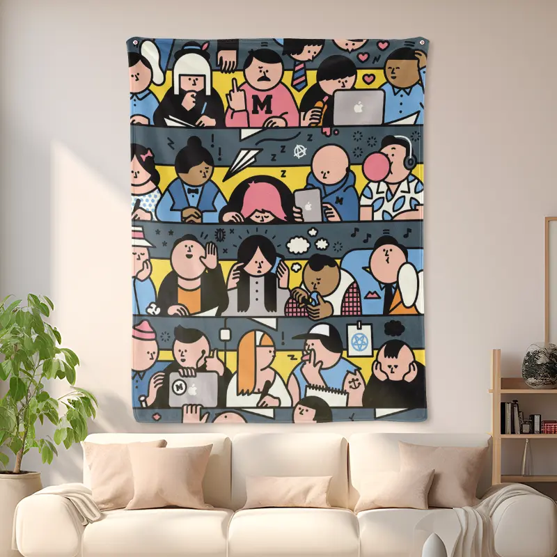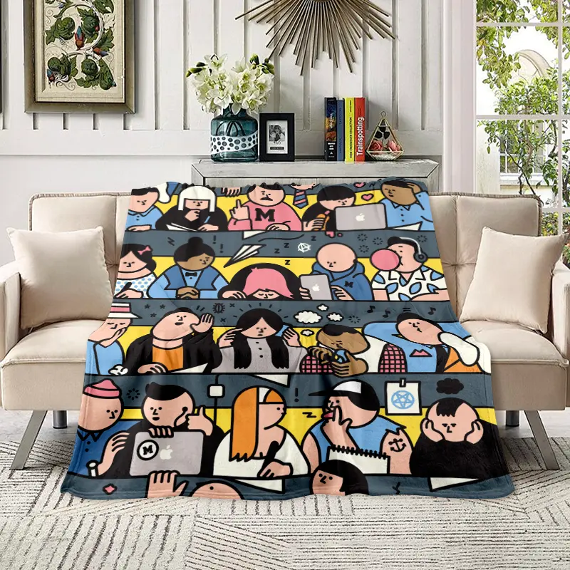 Soft Flannel Throw Blanket, Cute Commuter & Office Worker Cartoon Illustration Art Blanket, Cozy Daily City Life Crowd Scene Throw Blanket for Couch Bed, Aesthetic Urban Worker Decorative Blanket Gift for Home & Travel