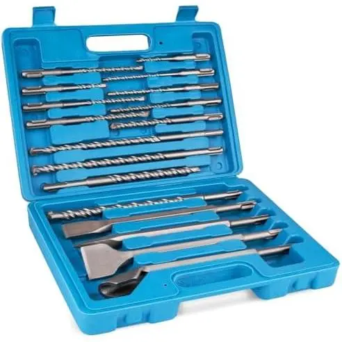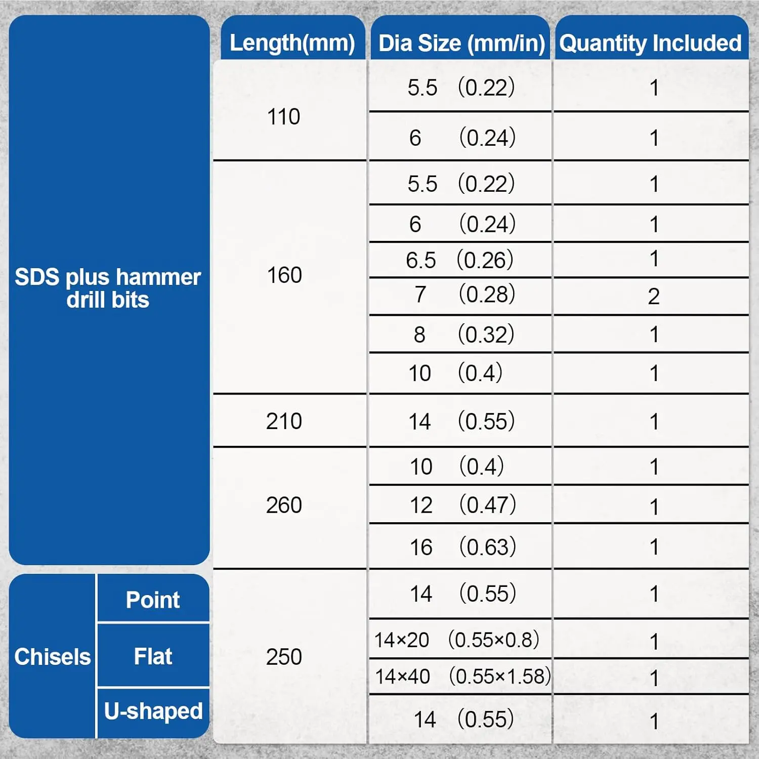 MULTIFUNCTIONAL USE: This 17- masonry drill bit set includes 13 bits, 5.5 mm, 6 mm, 6.5 mm, 7 mm, 8 mm, 10 mm, 12 mm, 14 mm, 16 mm (approx.3/16", 1/4", 5/16", 3/8", 1/2", 9/16", 5/8"), 1 x pointed chisel, 2 x flat chisels and 1 x u-groove chisel for different working occasions, greatly meets your use needs