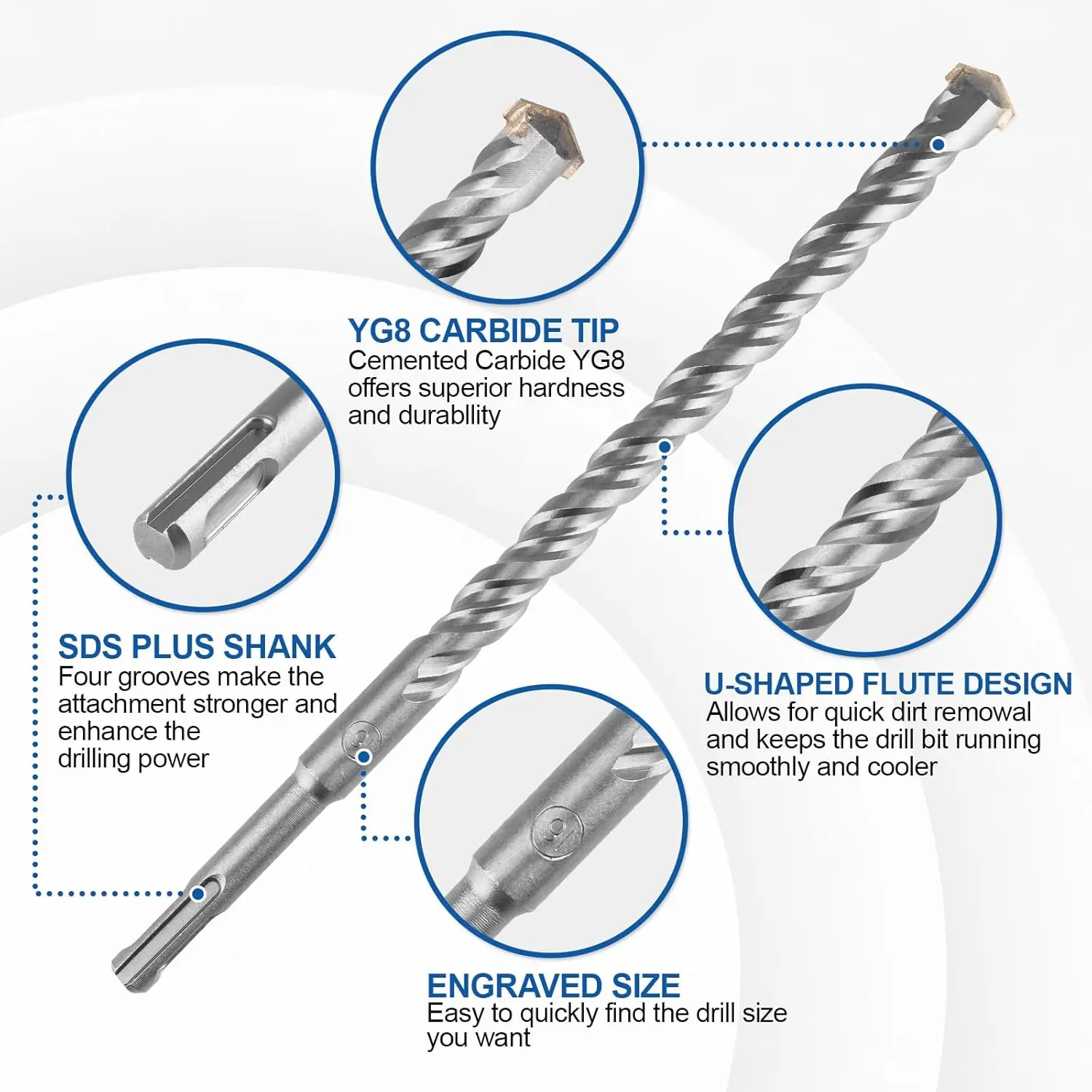 MATERIAL: This sds plus drill bit is made of 40CR and YG8 carbide material, the high hardness is ideal for high impact applications, easily handle a wide range of hard materials such as concrete, bricks, tiles, ceramic tiles, stone, and glass