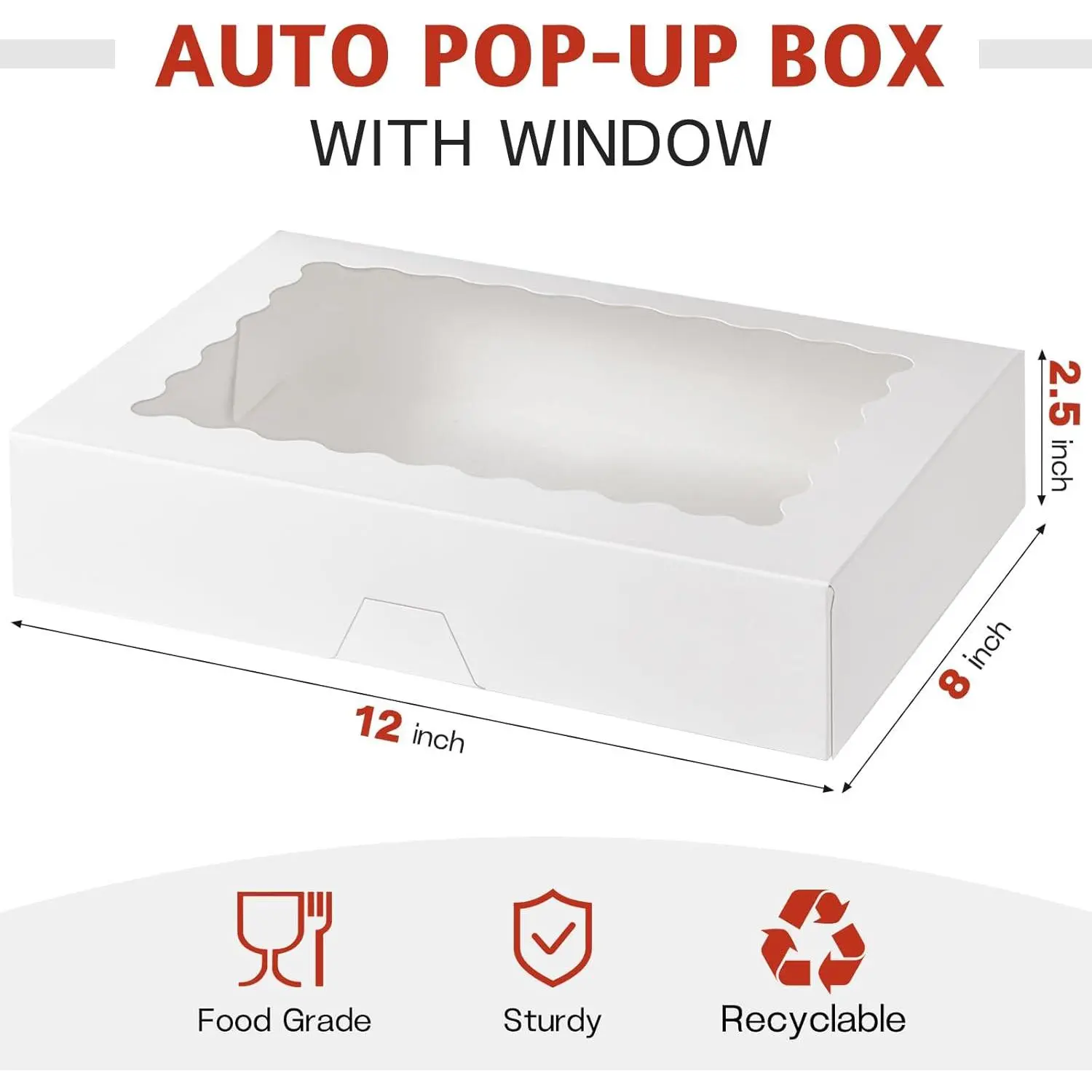 Wide Application: These 12" x 8" x 2.5" bakery boxes are ideal for 15-18 dipped strawberries, 10-15 sugar cookies, 12 cakesicles, 36 macarons, 15 cocoa bombs, muffins, donuts and other bakery goods