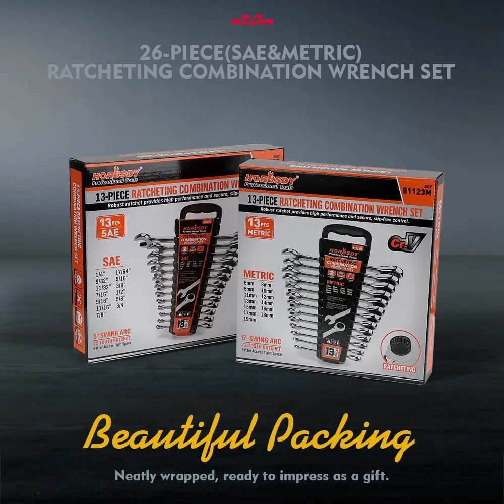 Efficient Design - Featuring a 72-tooth ratchet mechanism and a 5-degree swing arc, allowing you to easily access tight spaces, making this metric and standard ratchet wrench set highly efficientOrganized Storage - Comes with 2 protective wrench holders for easy organization and transport, ensuring your ratchet wrench set stays tidy, easily accessible, and ready for useReliable Performance - These ratchet wrenches are precision-engineered to provide reliable torque, ensuring no rounding when tightening or loosening bolts, making them a wrench set for professionals and DIY enthusiasts alikePremium Quality - This ratchet wrench set is made of high-strength chrome vanadium steel, offering superior durability and wear resistance, ensuring long-lasting performance in any taskMultiple Sizes - Includes 13 SAE and 13 Metric Wrenches, for Various Cars, Home Repairs, and DIY Tasks, Offering Ratchet Wrench Set Options to Meet Your Needs (1/4", 17/64", 9/32", 5/16", 11/32", 3/8", 7/16", 1/2", 9/16", 5/8", 11/16", 3/4", 7/8" and 6 mm, 8 mm, 9 mm, 10 mm, 11 mm, 12 mm, 13 mm, 14 mm, 15 mm, 16 mm, 17 mm, 18 mm, 19 mm)