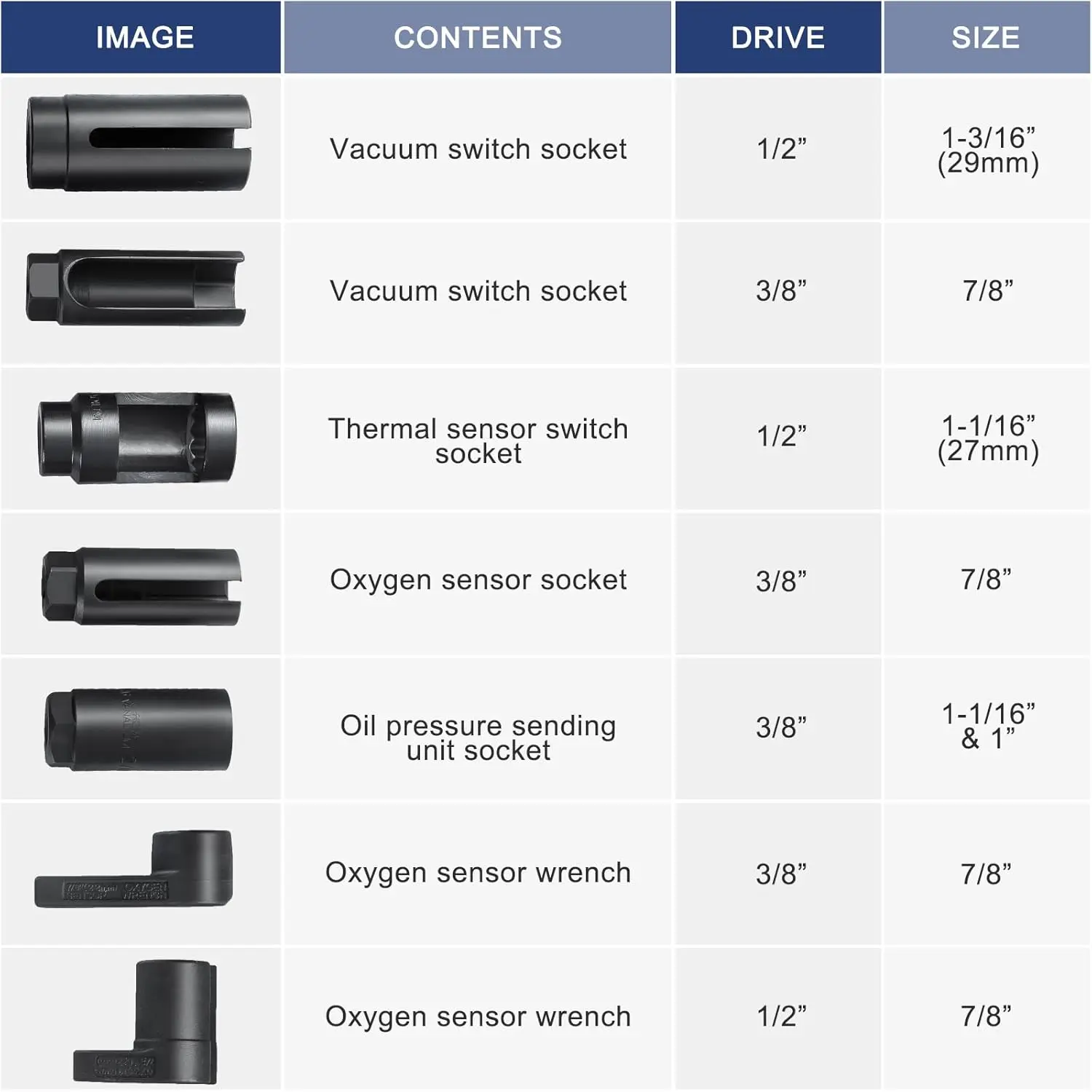 []This oxygen sensor socket set is made of high performance chrome molybdenum and solid cast steel construction for strength and durability.Black oxide coating on the surface to prevent rust and corrosion. [Design]Standard 6 point with low profile and side cutout design to enable you remove oxygen sensors with the wiring harness still attached, and the socket is offset and compact which allows extra leverage even in hard to reach spots. Large engraved sizes on each piece offer quick identification. [Easy Operation]The slotted design of the the oxygen sensor wrench allows you to remove oxygen sensors with the wiring still attached, while the offset wrenches allow for extra leverage with your breaker bar or ratchet even in hard-to-reach spotsthe precision forged slotting gives you maximum torque with minimum effort. [Wide Application]for removal and installation of oxygen sensors, oil pressure sending units, diesel injectors, vacuum switches, and thermal sensor switches. [7PCS Oil Pressure Sensor Socket Wrench Set]1" , 1-1/6", 1-3/16" Oil Pressure Sending Unit Socket1-1/16" GM Thermal Socket7/8" Short low Profile O2 Oxygen Sensor Socket7/8" Universal Oxygen Sensor Socket7/8" Universal Vacuum PVSTVS Socket Tool.
