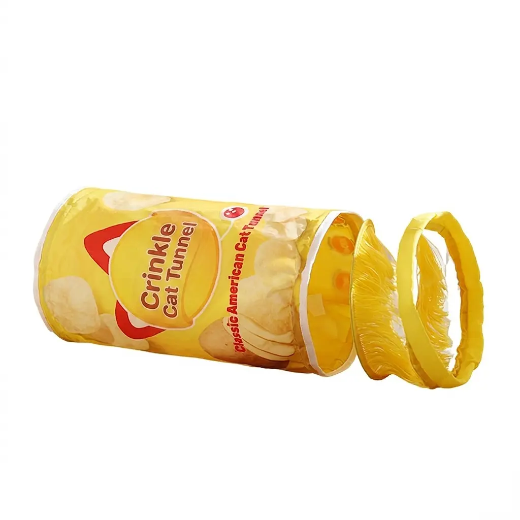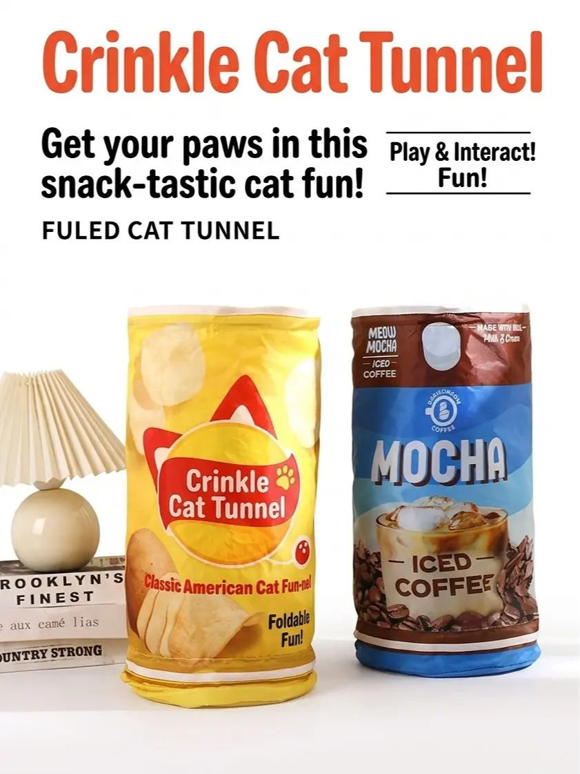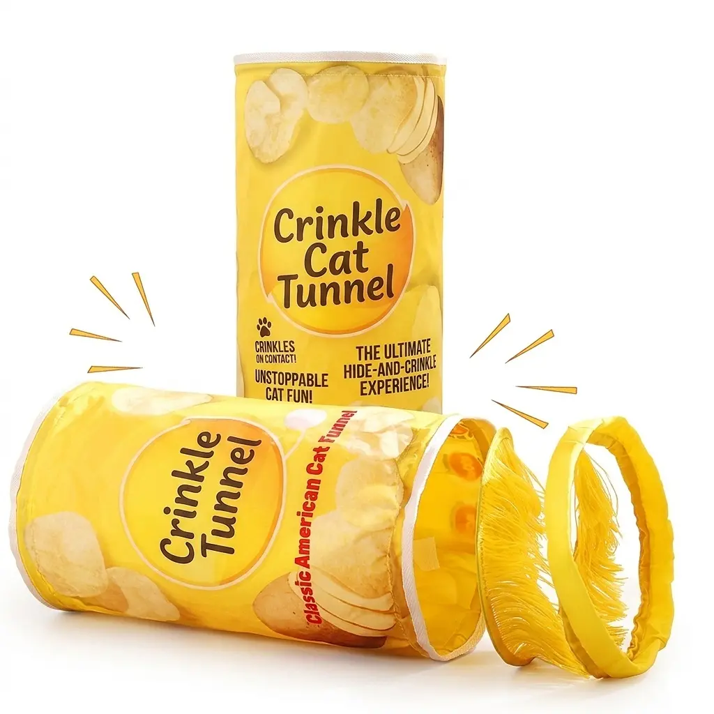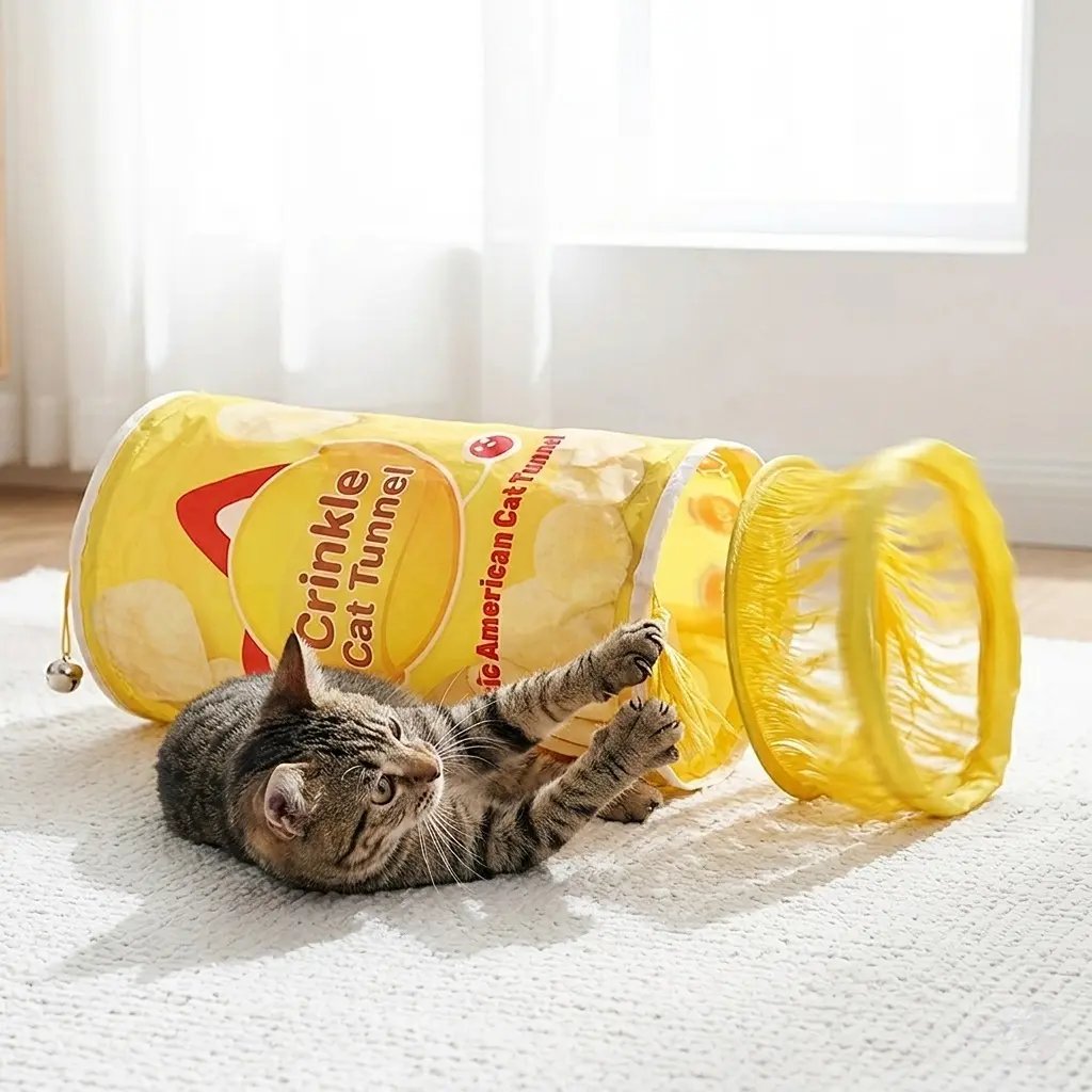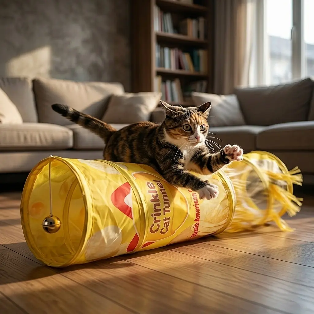 One end has a hanging toy that squeaks or jingles. The other end has soft tassels that dance with every breeze or bat of a paw. And the whole tunnel? It crinkles like dry leaves every time your cat moves.