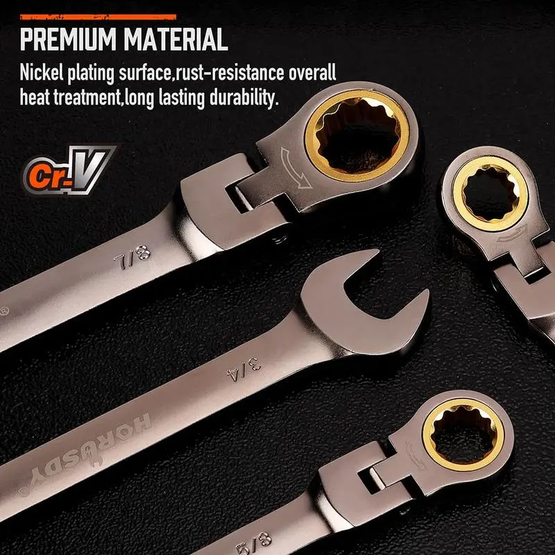 Flex-Head Wrench is Made of High-Strength Chrome-Vanadium Steel Construction to Ensure Durability and nickel plated for durability, these wrenches will deliver years of consistent performance.