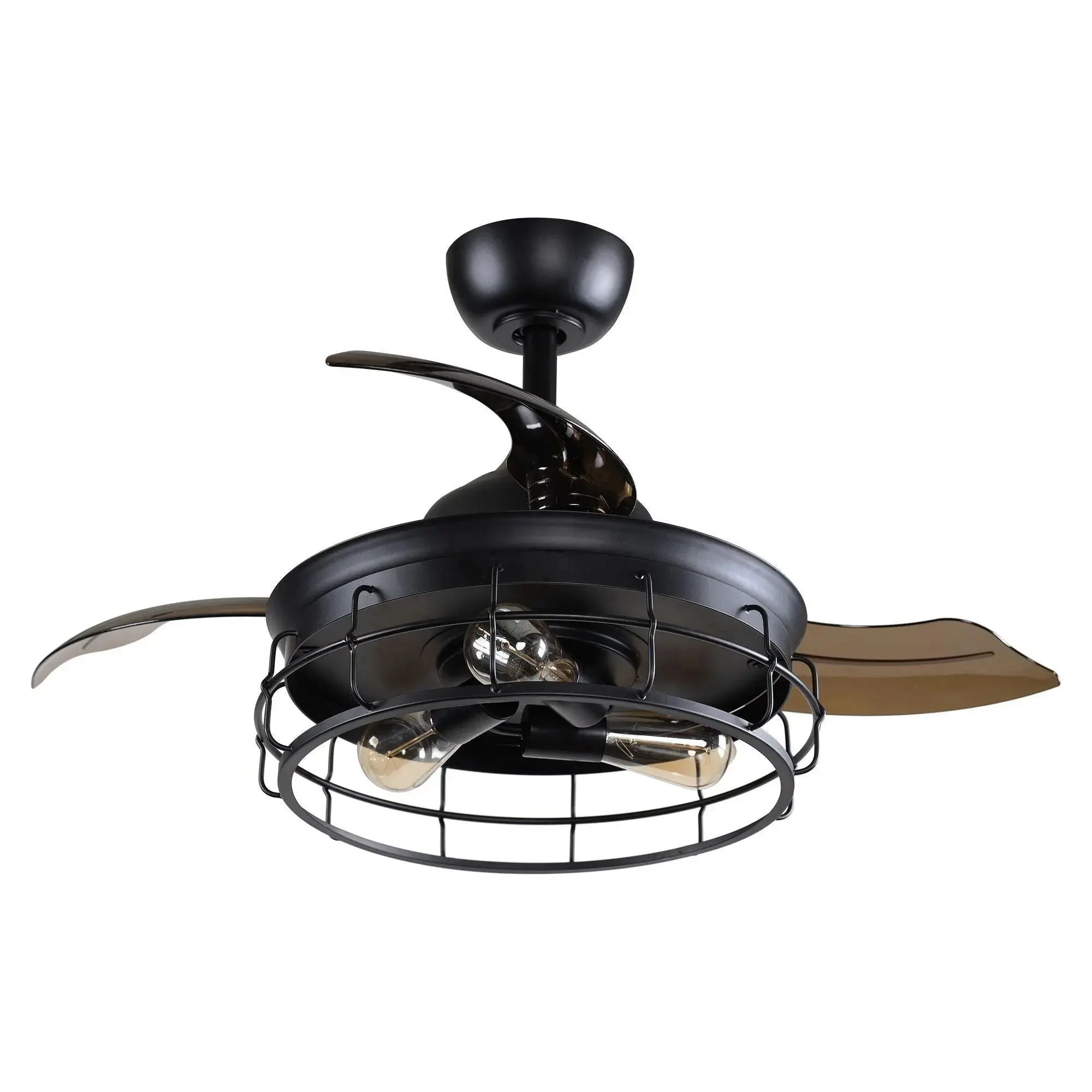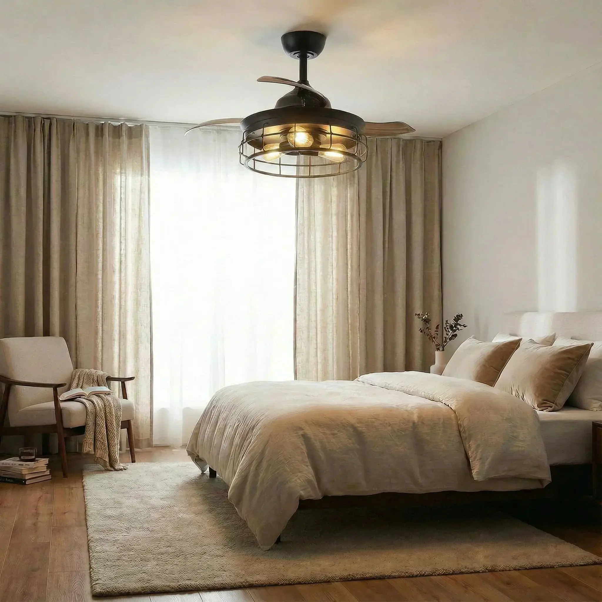 It is a combination of an industrial Caged flush mount and a retractable ceiling fan. When switched off, the intrusive fan blades automatically retract and conceal and visually the unit transforms into a slim, industrial flush mount light. Timing available.