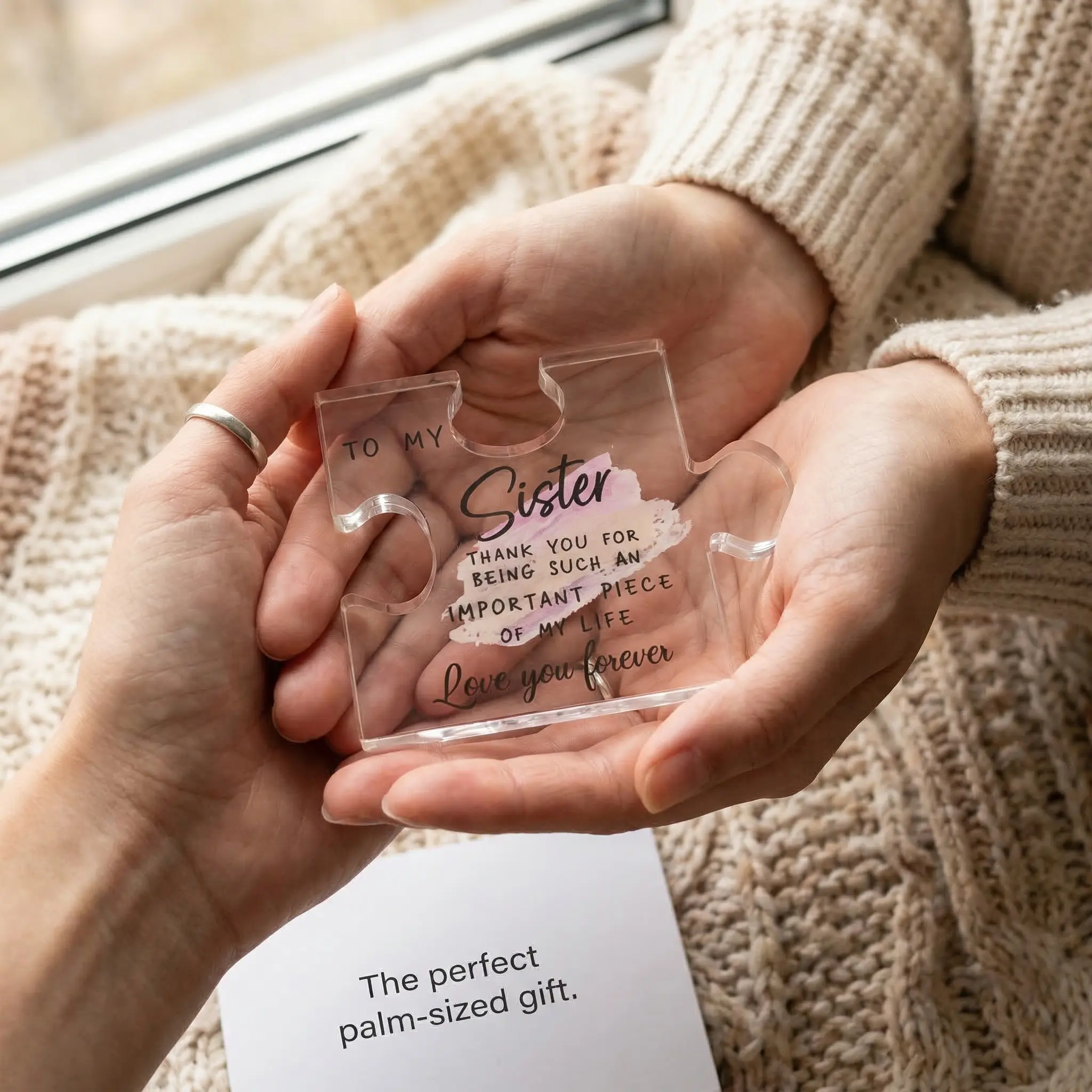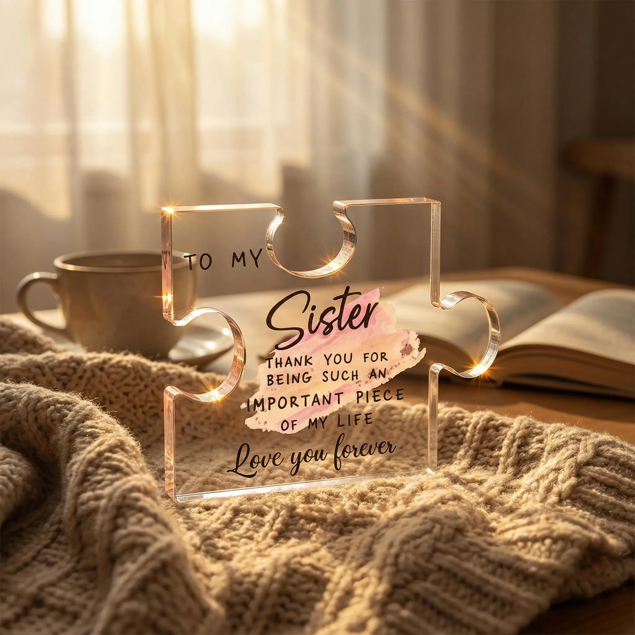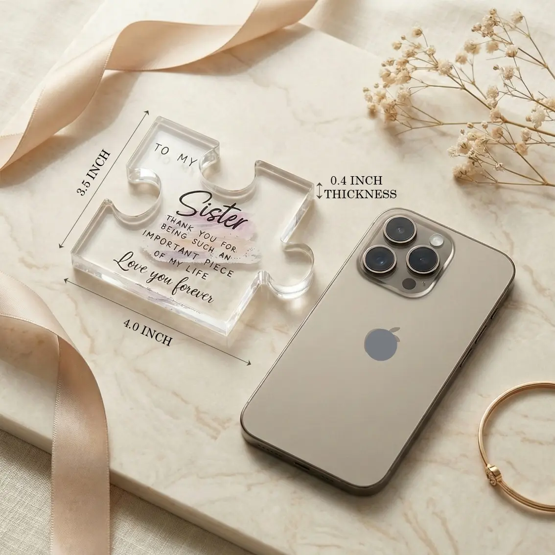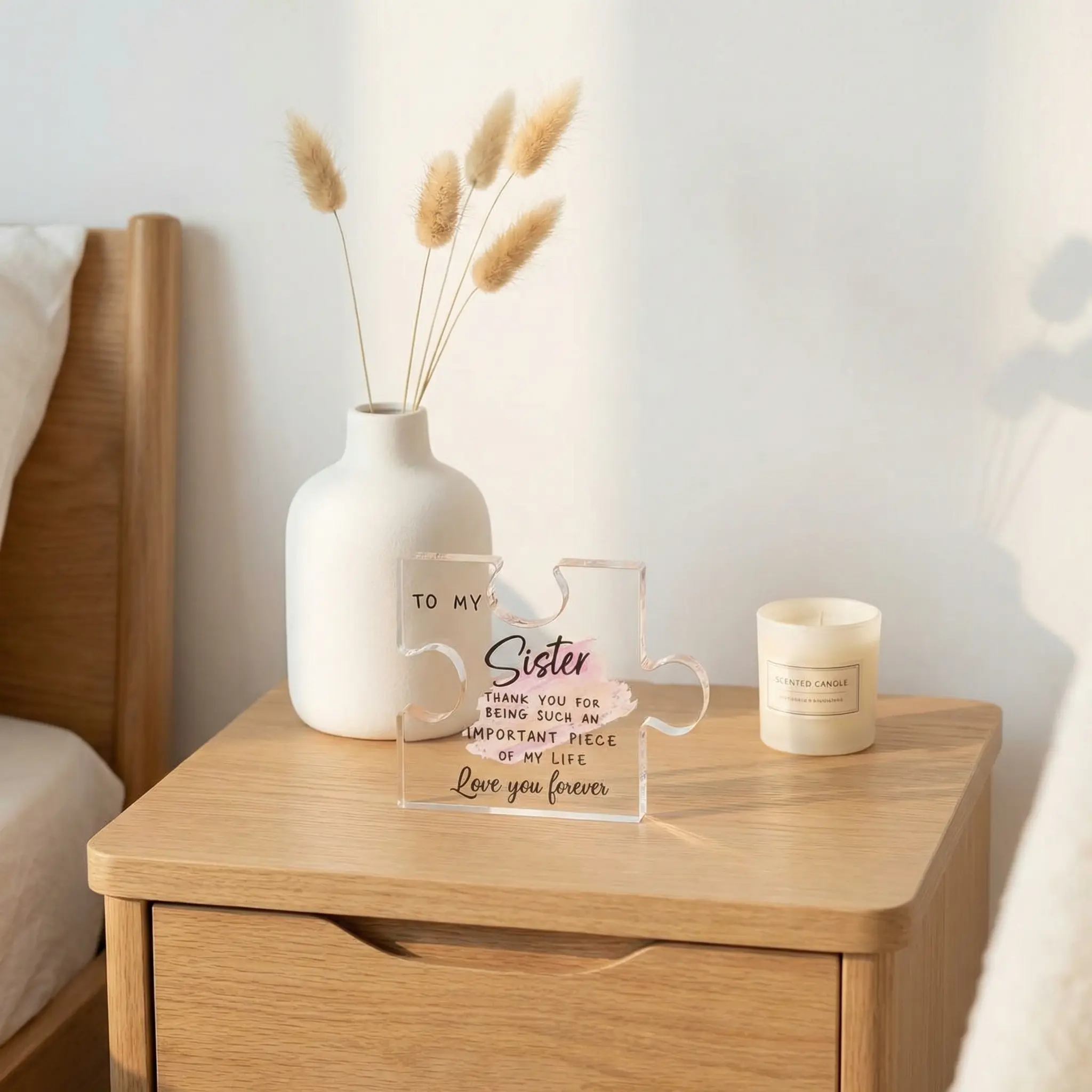Celebrate the bond between sisters and best friends with this flat 2D acrylic jigsaw plaque.This product is a 2D acrylic desktop ornament, not a 3D model or figurine.It measures 3.5*4in (≈8.5*10cm) with a thickness of 0.4in (≈1cm).Designed as a compact and delicate keepsake, it is ideal for desktop display, small spaces, and decorative use.