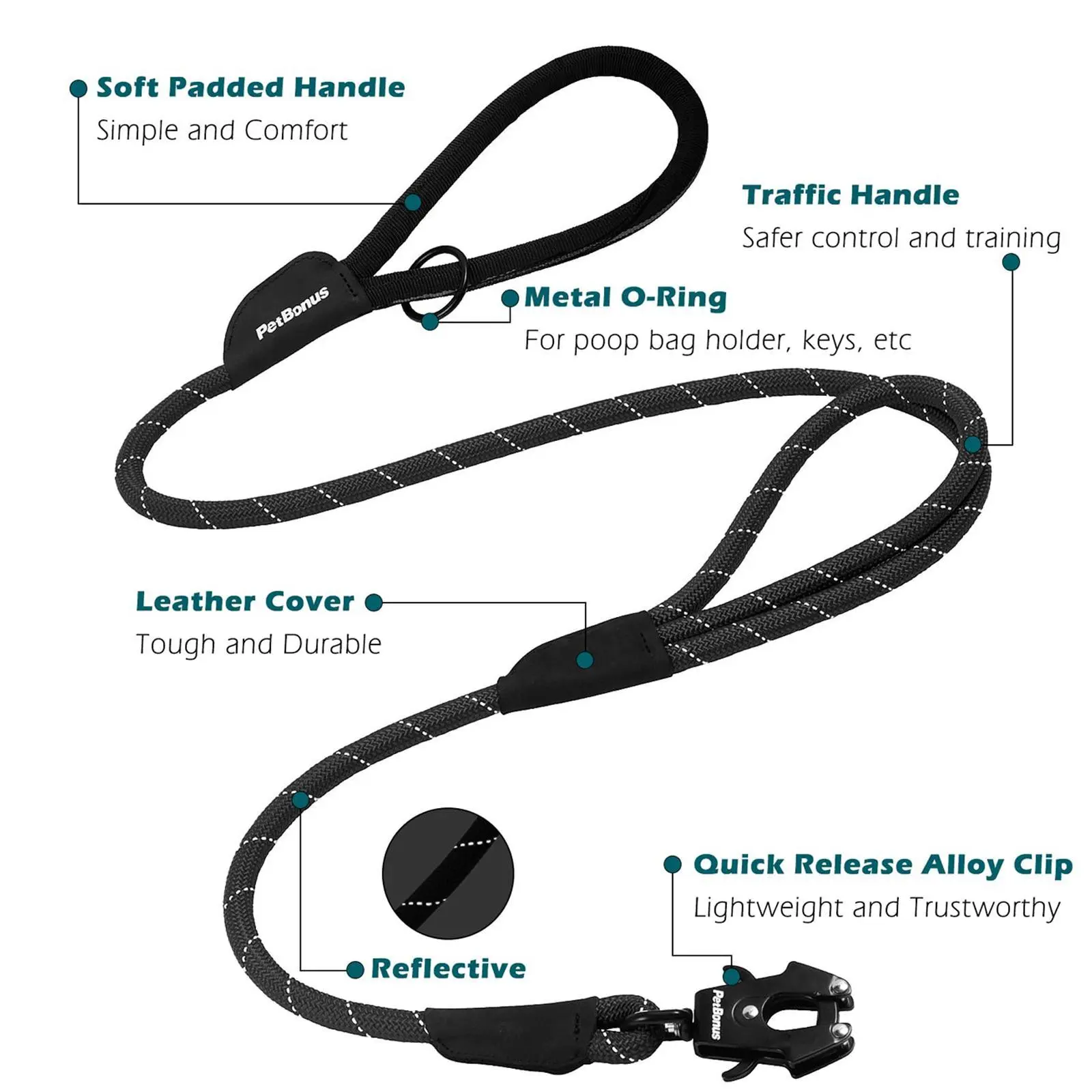 5. PetBonus Two Handles Dog Leash, 5FT Heavy Duty Pet Rope Leash with Quick Release Metal Clip, Comfortable Durable Traffic Handle, Reflective Training Lead for Medium Large Dogs