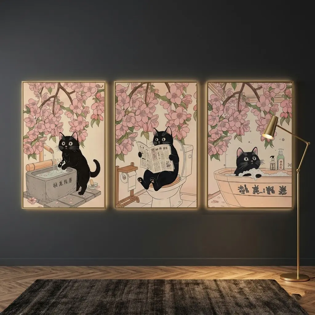 3-Piece Art Set: Three adorable black cat art prints that effortlessly add a touch of cute, vibrant color to your bathroom.