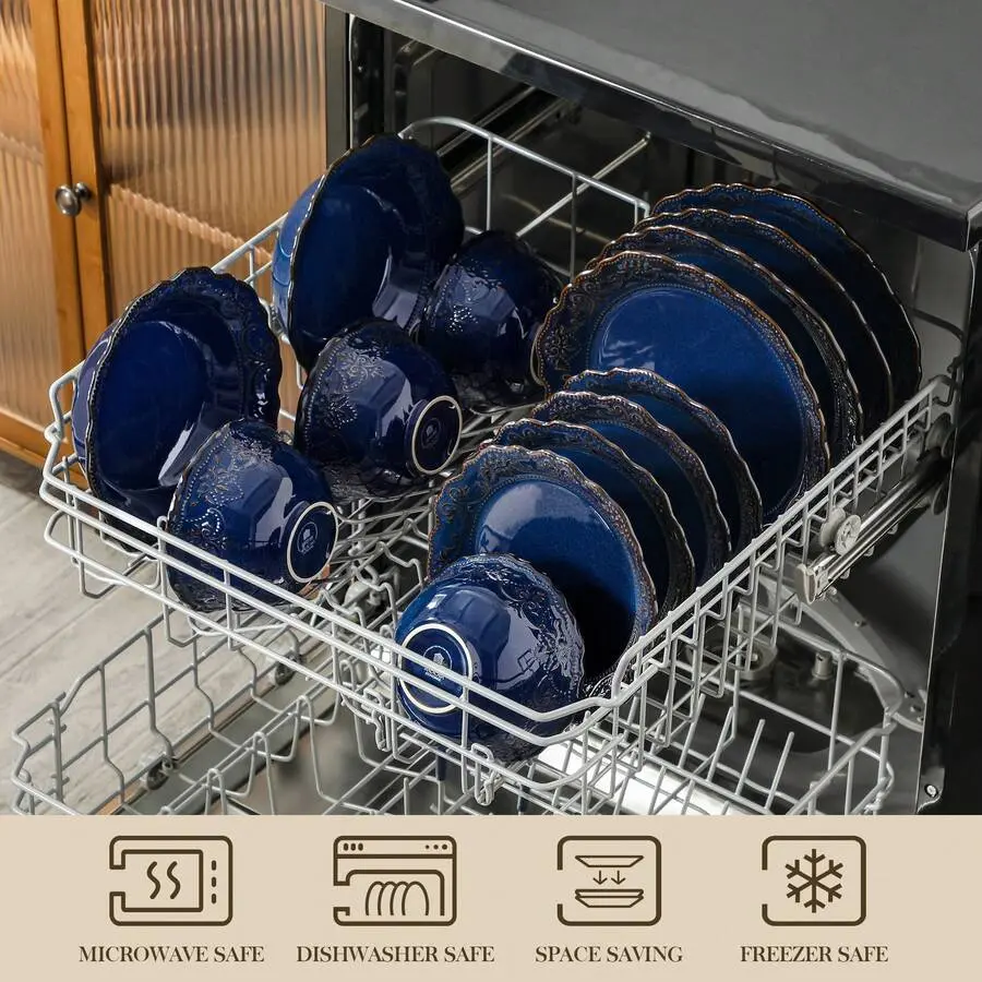 16 Piece Ceramic Dinnerware Sets, Kitchen Dinnerware, Blue Dinnerware With Bas-Relief Around The Edge, For 4 People, Dinner Plate, Dessert Plate, Bowl And Soup Plate