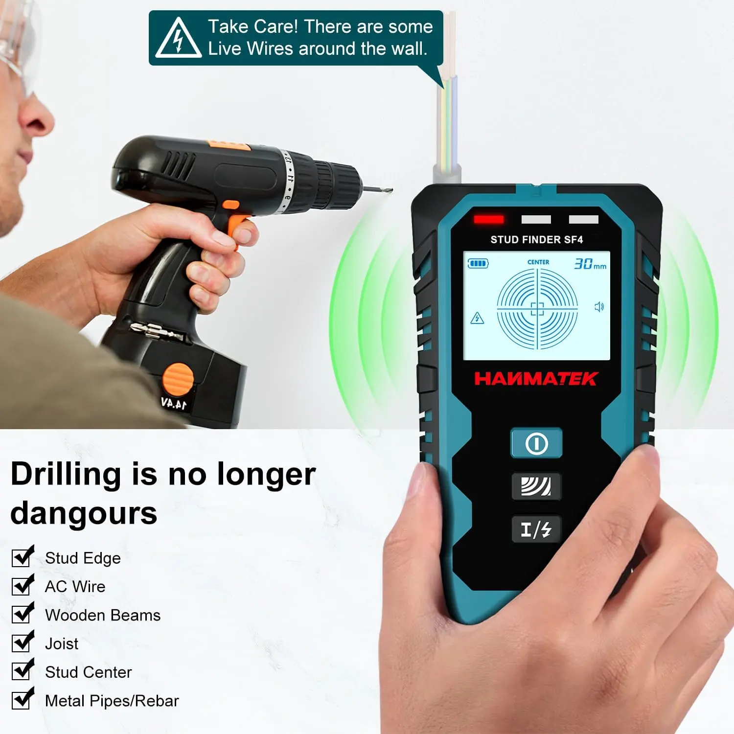 Accurate and Rapid Detection: The stud finder uses a microprocessor chip for precise detection of metal, studs, joists, pipes, and live AC wire behind walls, floors, and ceilings.Save time and effort with fast and accurate results.High Visibility LCD Display: Equipped with a bright backlit LCD display, this stud scanner shows the center, edge, and location of detected studs, along with battery status.Audio alerts and beep sound guide you to the exact stud location, even in low-light settings.Unique Home Improvement Tool: Perfect for hanging shelves or heavy objects on walls without damage, detecting live wires and pipes, and preventing accidents and costly repairs.A practical and thoughtful gift for safety-conscious DIY enthusiasts.Multiple Scan Modes: Offers stud scan, deep scan, and metal scan modes for detecting various materials and depths.Find the center of studs, width of larger objects like pipes and wires, and presence of metal for peace of mind during home projects.Wide Range of Use: Versatile and reliable, this stud detector quickly locates wood, metal, and AC wires in walls, floors, and ceilings.Ideal for installing TV mounts, photo frames, wall cabinets, garage racks, shelves, bathroom handles, and other decorations with ease.