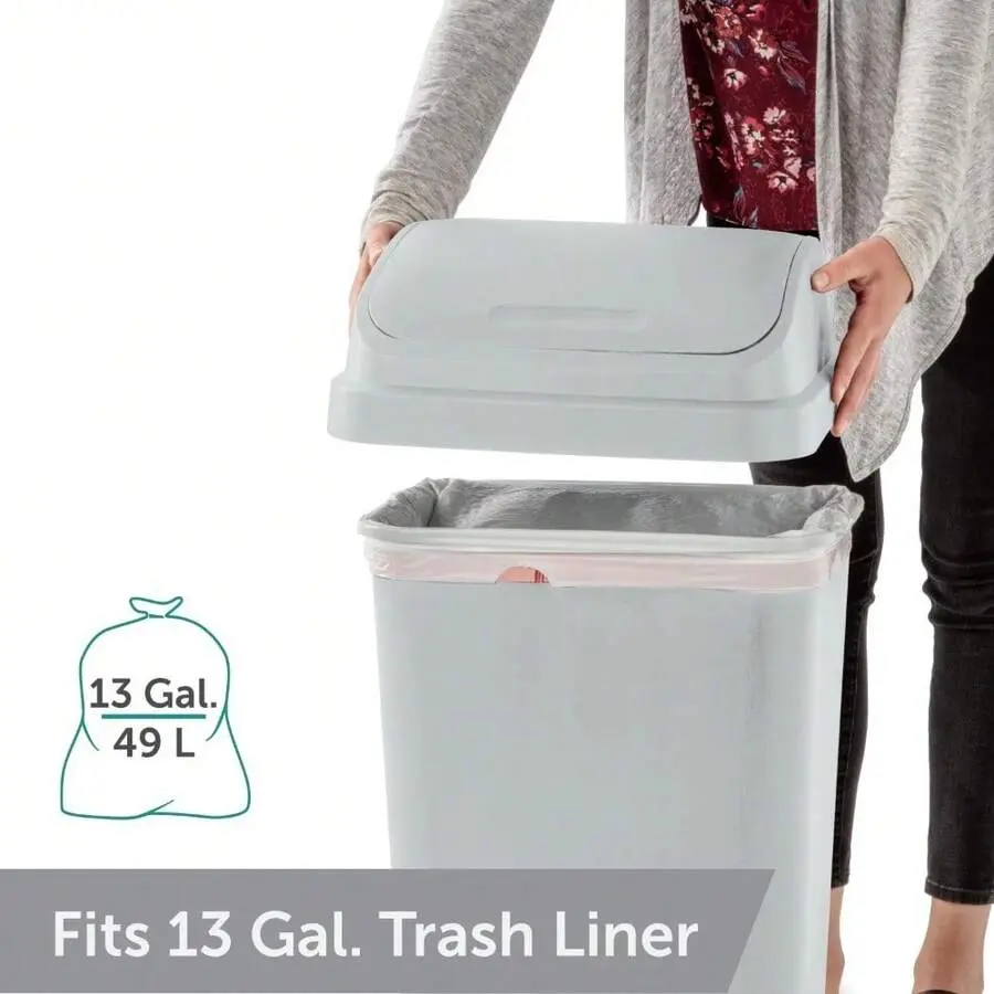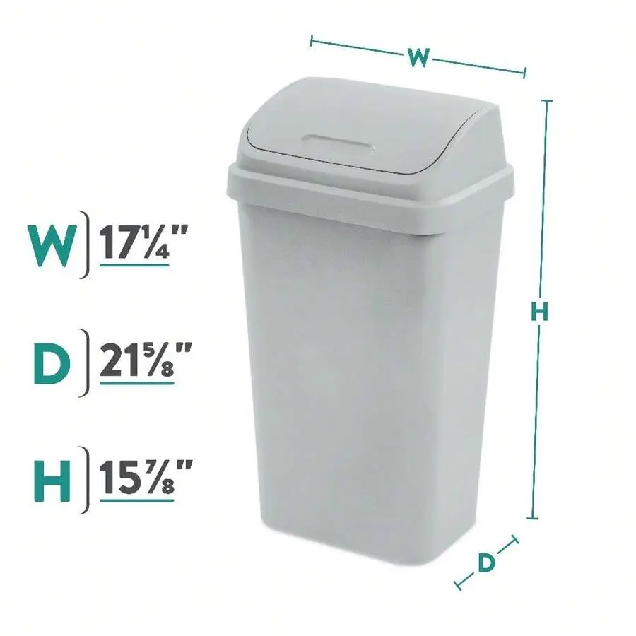 The Kitchen Trash Can, 13 Gallon Plastic Garbage Bin with Swing Top Lid, Light Gray combines modern style and practical convenience for busy kitchens. Its sleek square design and textured finish complement any home decor while providing durable daily use. The swing-top lid allows for effortless one-handed disposal, even when the can is placed flush against a wall or cabinet. Sized for standard 13-gallon liners, this sturdy plastic garbage bin keeps your kitchen organized and makes cleanup quick and simple. Perfect for kitchens, garages, or workspaces, it's a reliable and stylish waste solution for any home. Kitchen Trash Can, 13 Gallon Plastic Garbage Bin with Swing Top Lid, Light Gray13 gallon capacity: accommodates standard liners for kitchen trash or household garbage, providing ample space for daily disposal needsSwing-top lid: opens easily with one hand and stays open for quick, effortless cleanup in busy kitchensSpace-saving square design: fits snugly against walls or cabinets to maximize floor space without sacrificing style or functionalityDurable plastic construction: built to withstand daily use, easy to clean, and keeps garbage contained while reducing odorsVersatile placement: ideal for kitchens, offices, garages, or workspaces that need a reliable waste solution and phthalate-free: made from , materials for a healthy home environment