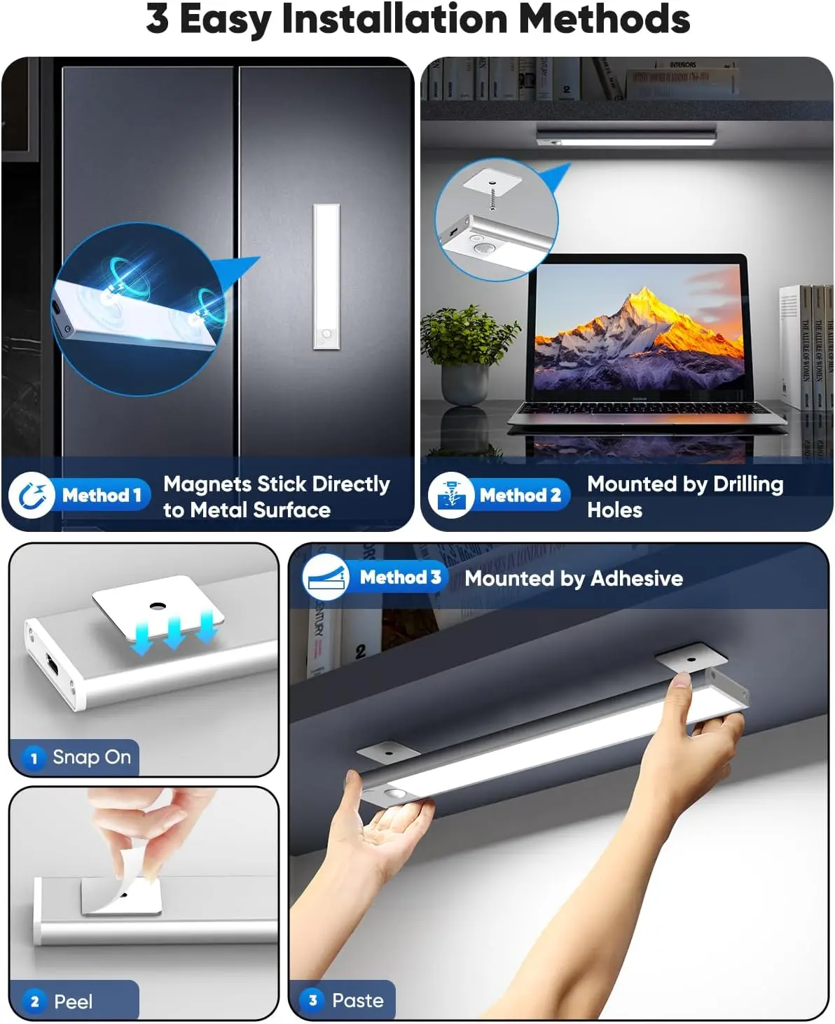 ·Dimmable & Change Color: Lights under cabinets in the kitchen truly shine with their remarkable versatility. Under cabinet motion sensor lighting allows you to choose 3 color temps (3000K warm/4500K natural/6000K cool) and 10 brightness levels. Dial up the illumination for cooking or prepping tasks, or dim it down for a soft ambient glow—ideal for various kitchen activities, organization, or setting a relaxing mood