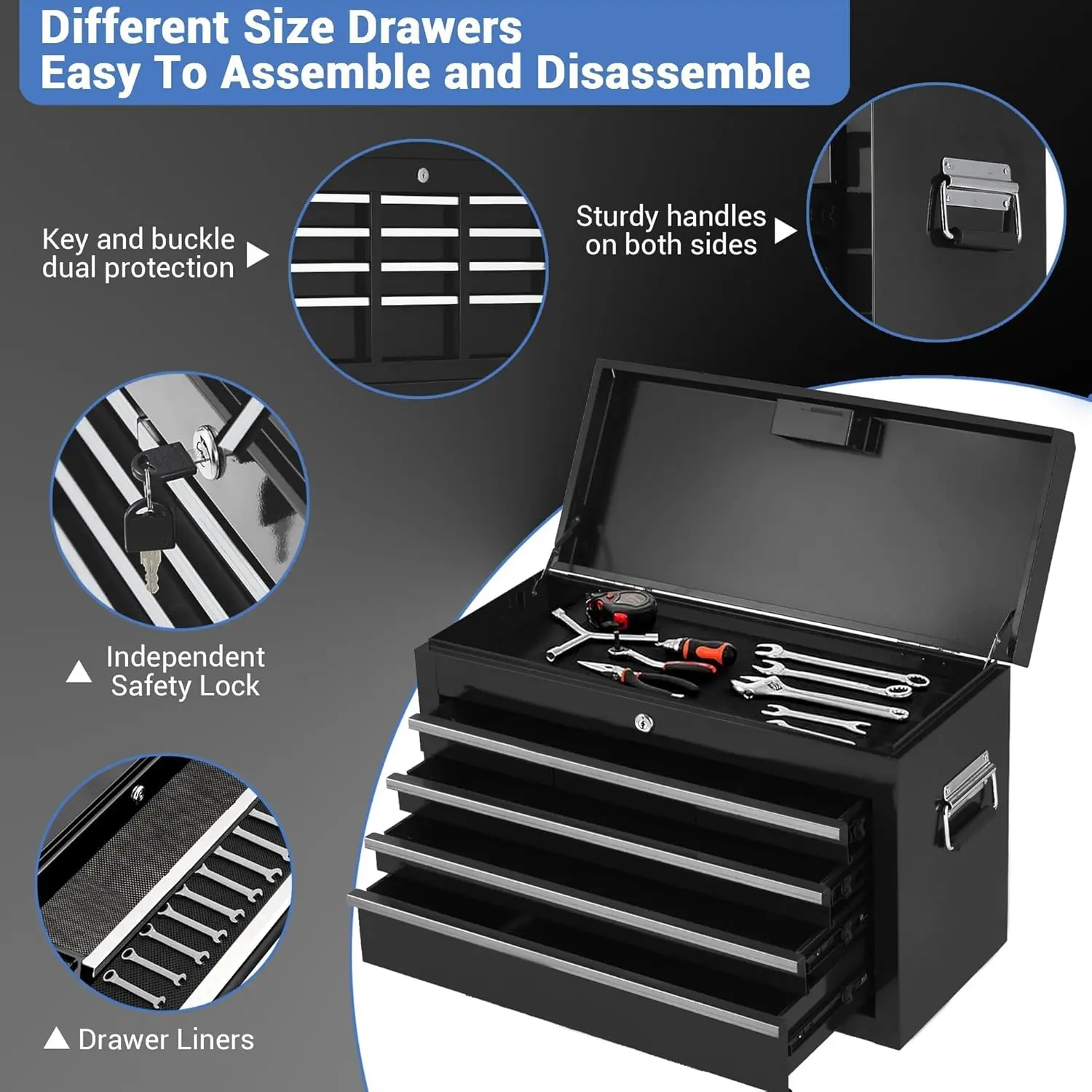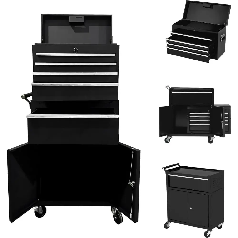 ·【5-drawer high-capacity organization】Five drawers in varied heights keep sockets, wrenches, hand tools, and power tools sorted for faster workflow. Use as a tool organizer and tool storage cabinet to reduce clutter and maximize space in Tool Chests & Cabinets applications.