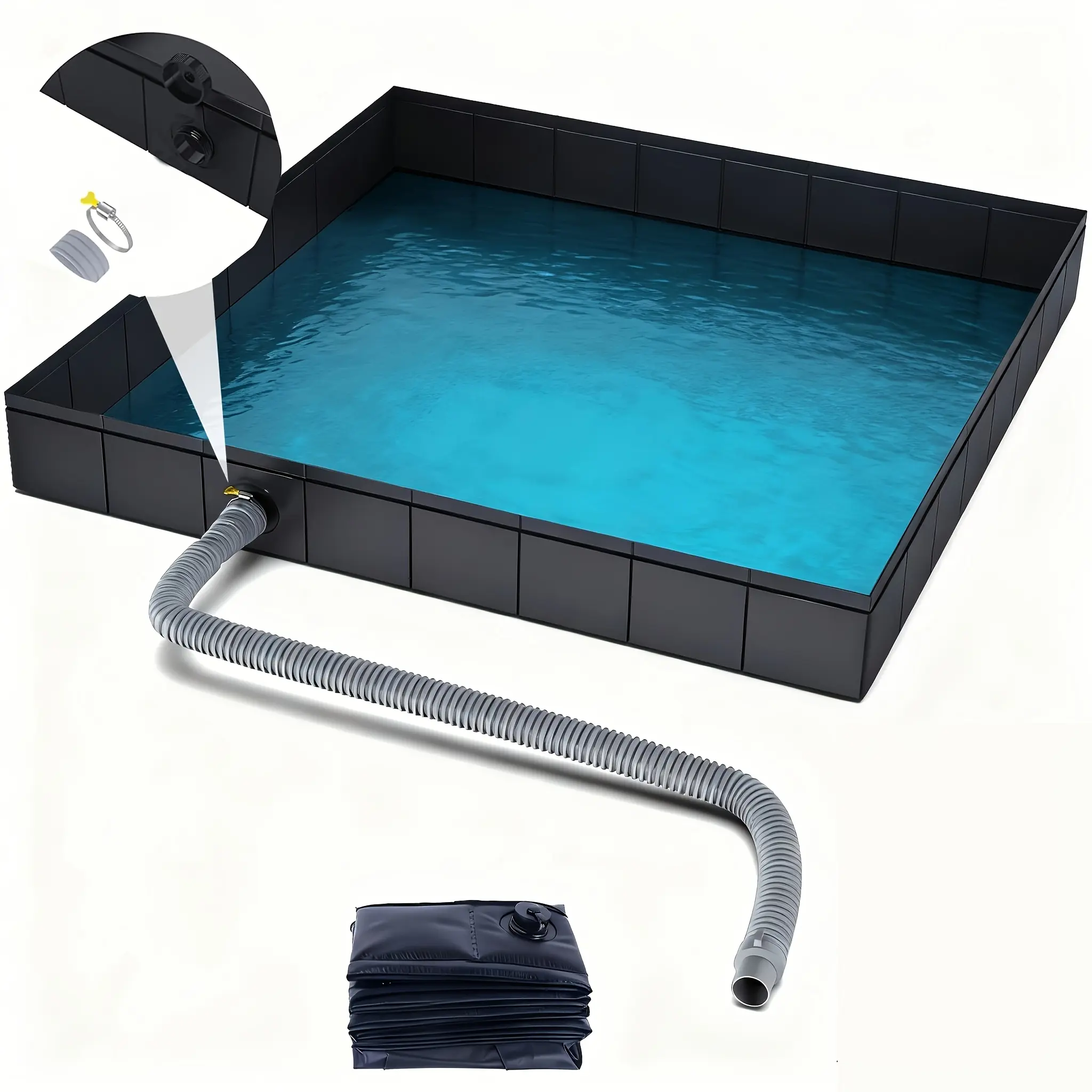 The tray comes with a flexible hose and a folded base, making it easy to set up. The image shows the tray filled with water, demonstrating its functionality. The hose connects to the tray, ensuring a convenient shower experience. 🚿