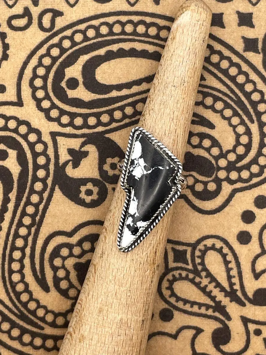 This bold one-of-a-kind ring features a striking lightning bolt–shaped White Buffalo stone with beautiful natural black and white patterns. Mined in Arizona and stabilized for durability, White Buffalo is prized for its rare and distinctive appearance.