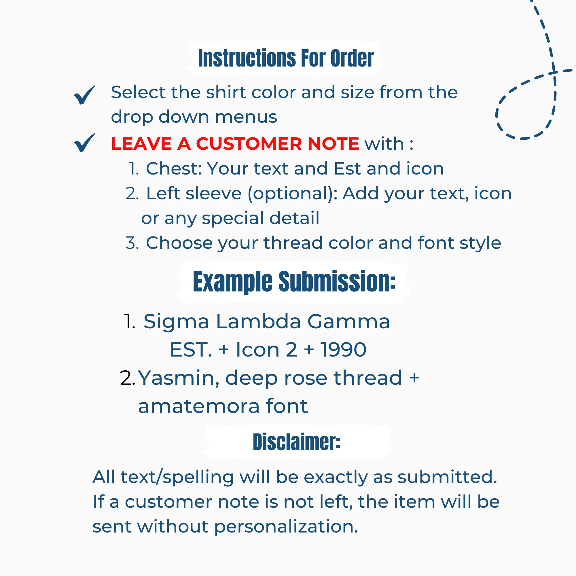 To personalize your order, please leave the following in the "Order Note" at checkout: