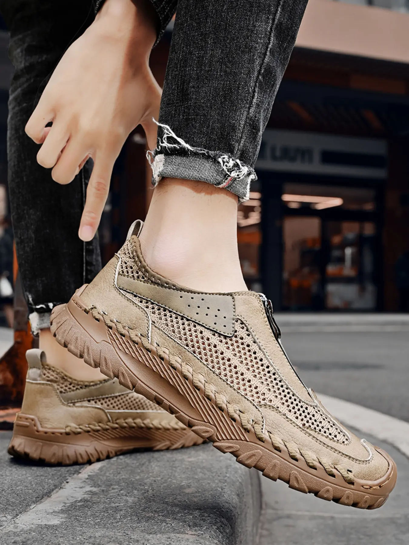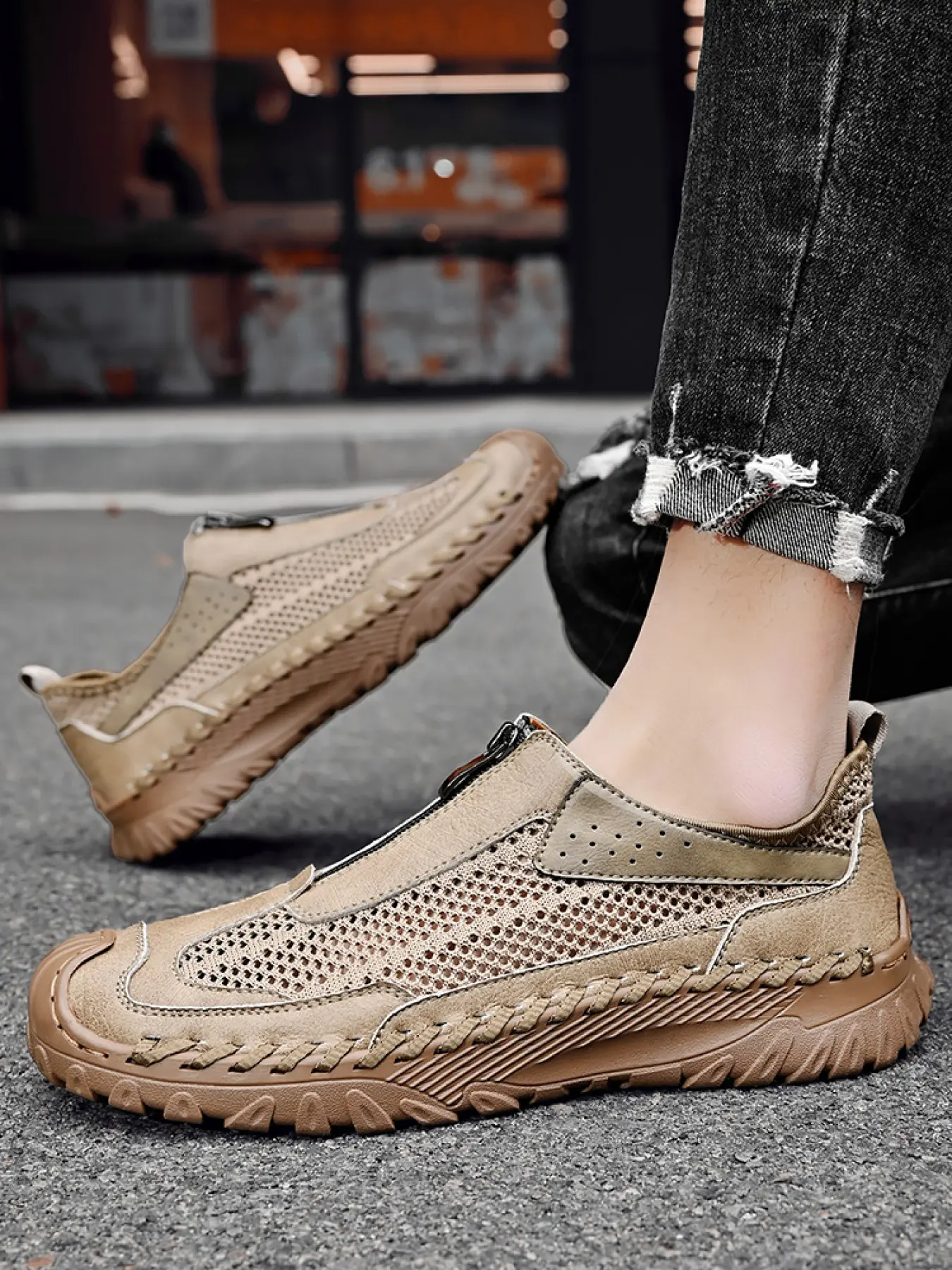 Men's Solid Color Mesh Zipper Toe Casual Shoes, Soft Sole, Non-Slip, Hand-Stitched, Breathable Slip-On Lazy Dad Shoes