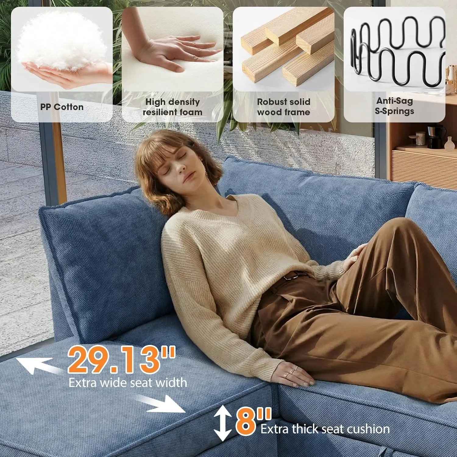·【Solid Wood Frame & Sturdy Load-Bearing】Built with a solid wood frame and reinforced joints, this oversized sectional sofa delivers high stability and sturdiness. As one of the large sectional couches for living room, each seat supports up to 330 lbs for heavy daily use. The solid structure avoids creaks and deformation, ensuring long-lasting durability for sectional sofa products.