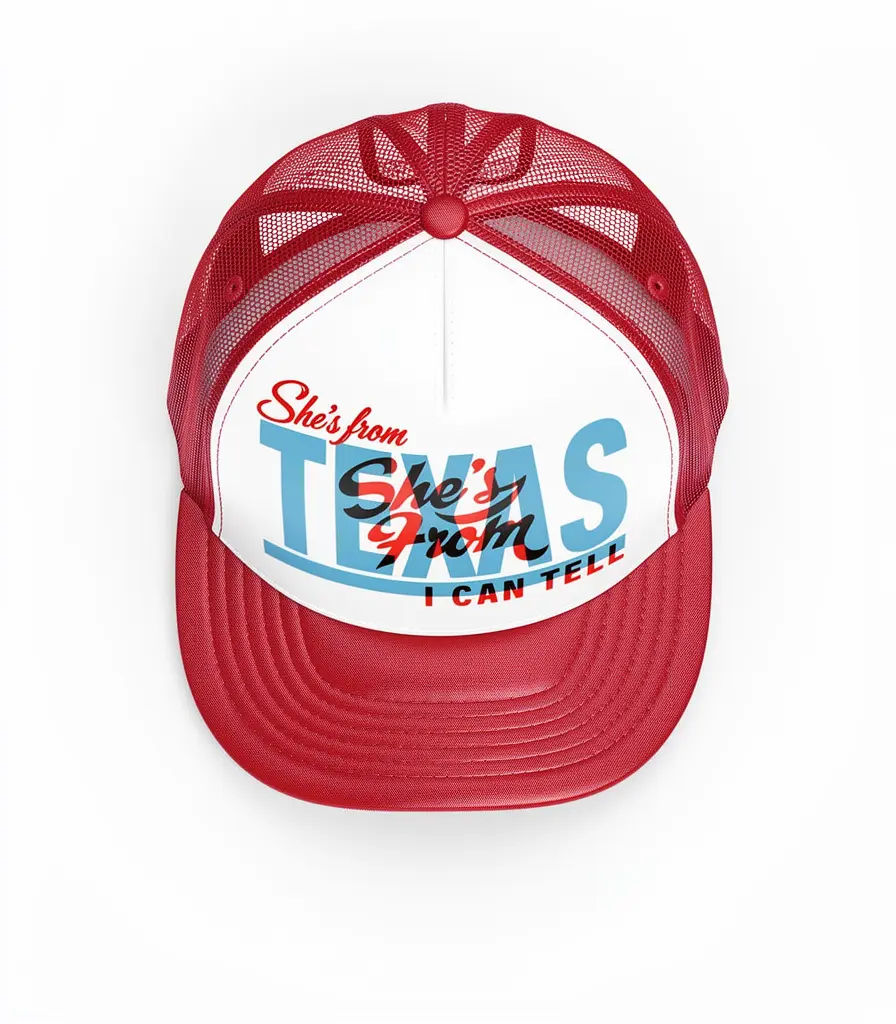 Yee-haw, Texas girls! This adorable trucker hat screams Southern pride with bold “She’s From Texas” embroidery on a classic mesh snapback design. Perfectly cute yet tough, it features a structured front panel, breathable mesh back, and adjustable fit that flatters every cowgirl. Whether you’re repping your roots at the rodeo, tailgating on game day, road-tripping across the South, or just adding that country-cute vibe to your everyday streetwear — this hat is your new go-to flex.