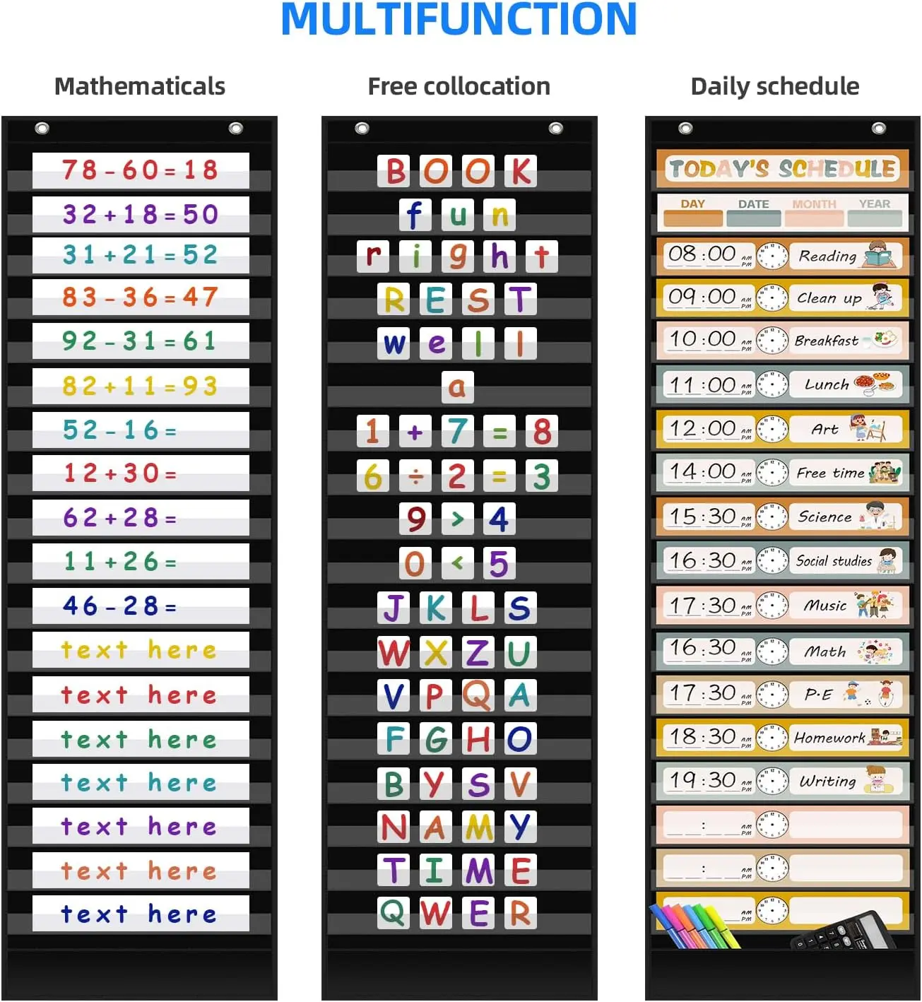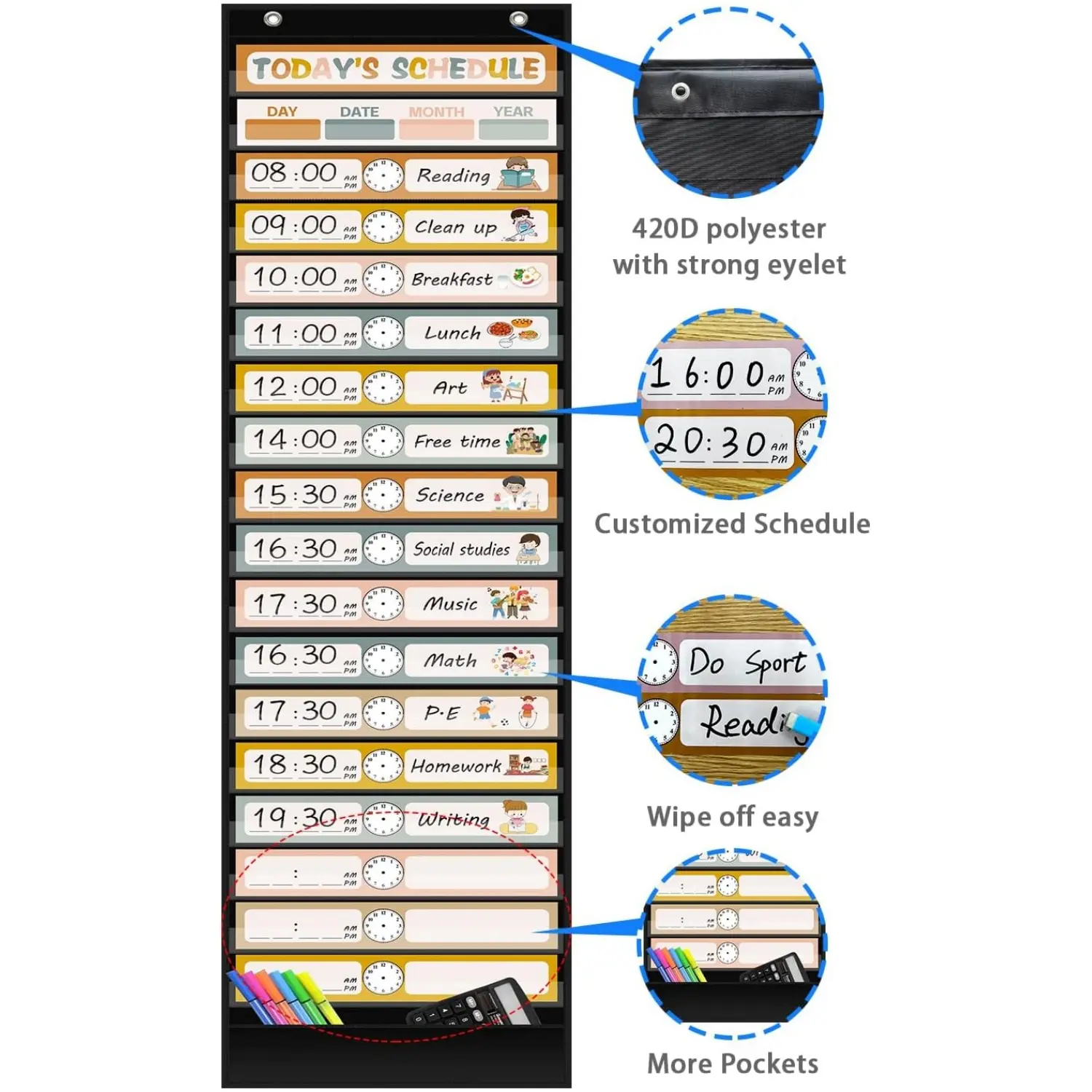 【Easy to Hang】There are 2 adhesive hooks and 2 door hooks for this schedule pocket chart, easy to hang on the wall or door, saving your space to make your life more interesting.