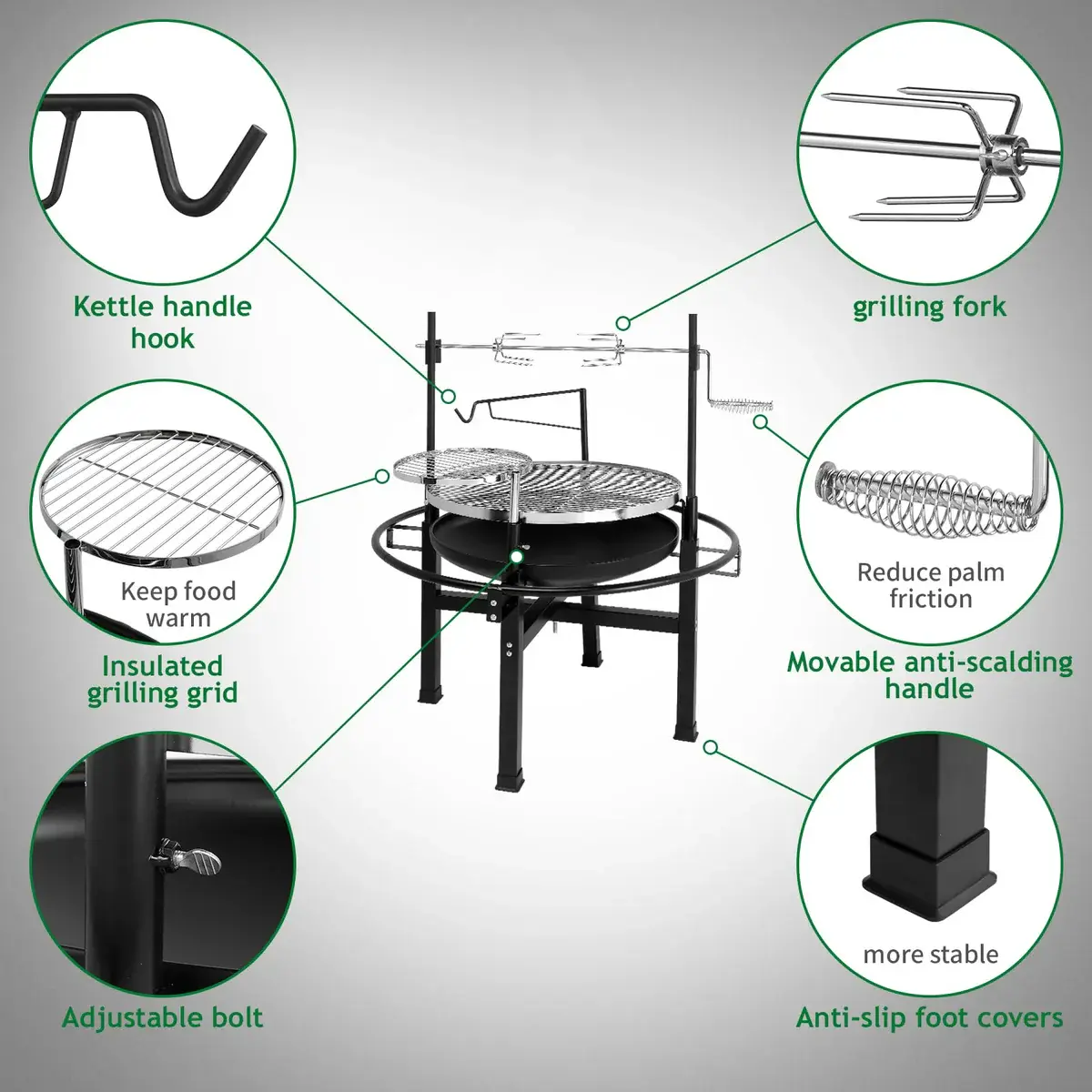 2. Multi Functional Design: Two rotating cooking grates with different heights. The grill can be adjusted up and down and fixed in place by a lock pin for safety. One can be used for baking food such as meat, vegetables or marshmallows, while the other can be used for heat preservation.