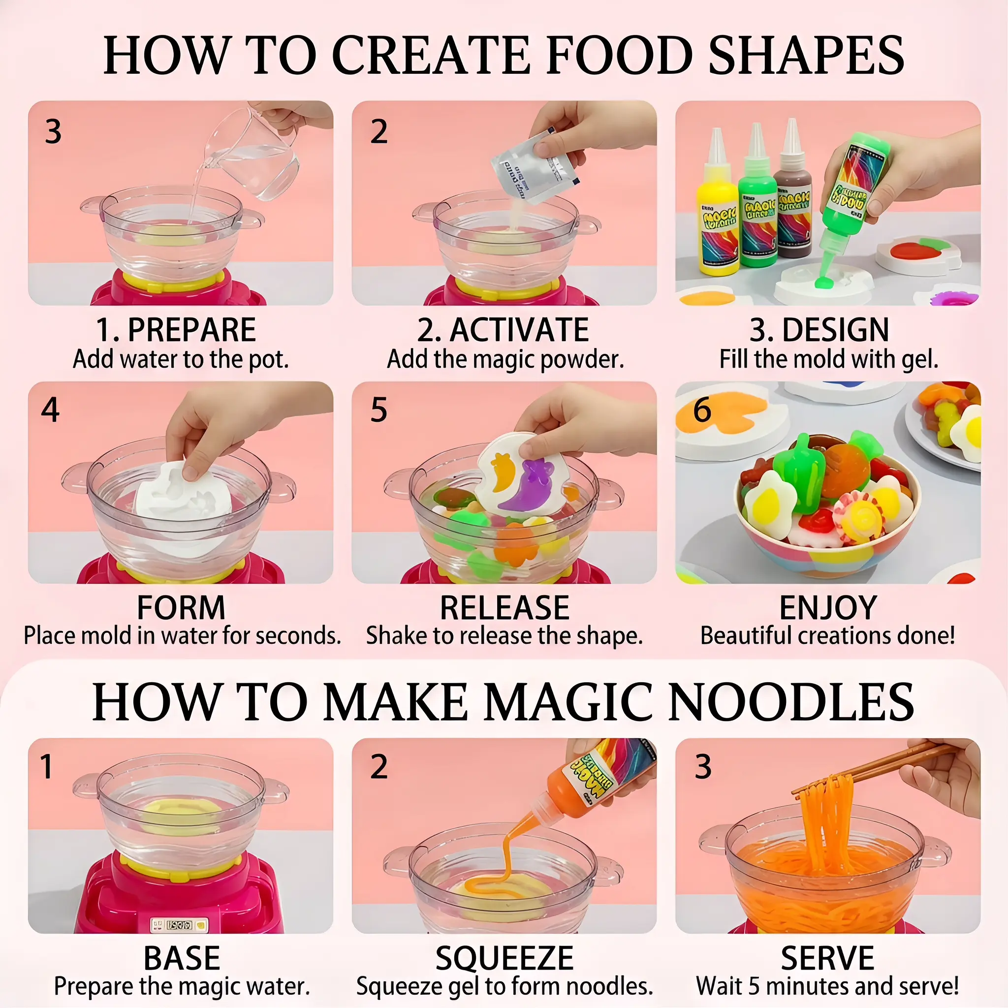 ·The Magic Water Elf Toy Kit includes 6 colorful magic gels, 8 food creature molds, 4 packs of magic powder, and 1 net. Kids can create their own magic water pets and watch them come to life in water.