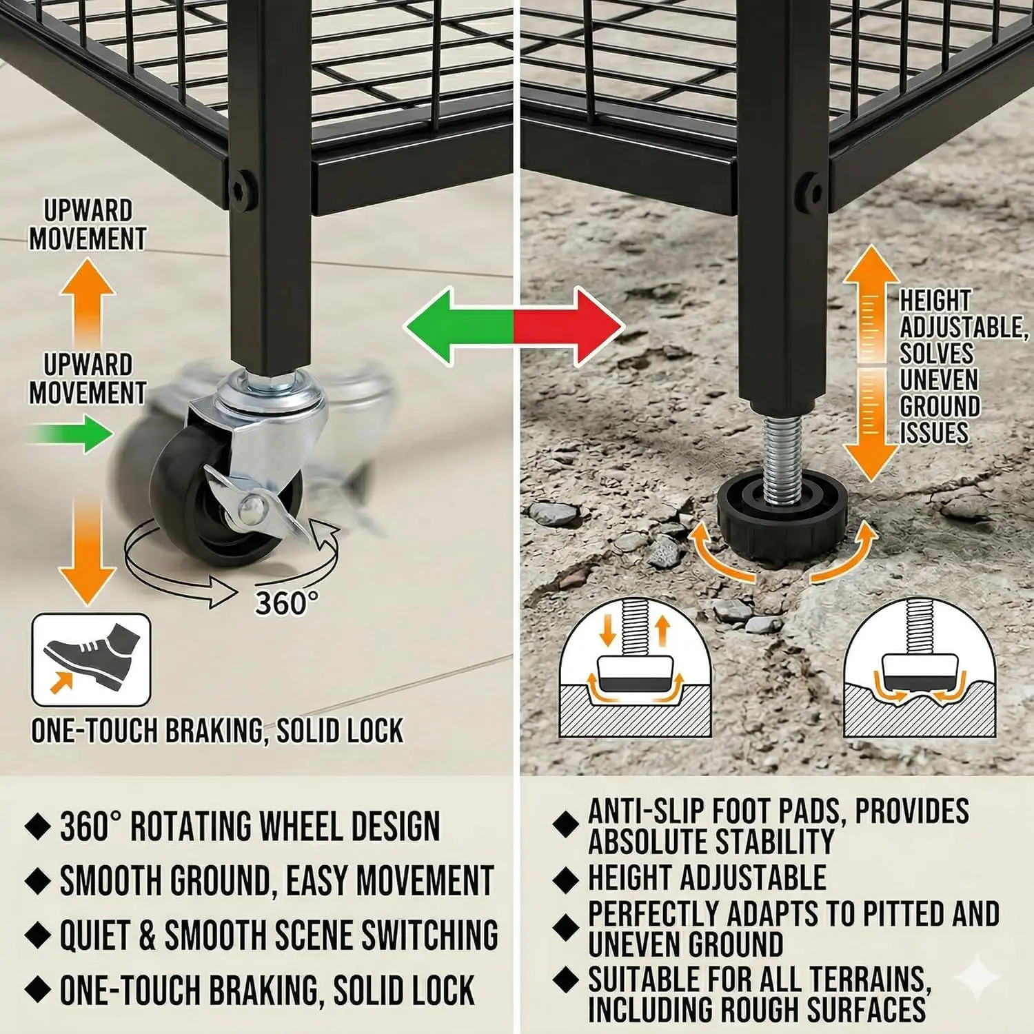 ·ALL-TERRAIN DUAL BASE OPTIONS: Adapt your merchandising display to any terrain. This complete kit includes 4 silent, lockable caster wheels for effortless gliding across smooth convenience store floors. Swap them out for the 4 adjustable leveling foot pads to ensure absolute, wobble-free stability on uneven outdoor surfaces at farmers markets.
