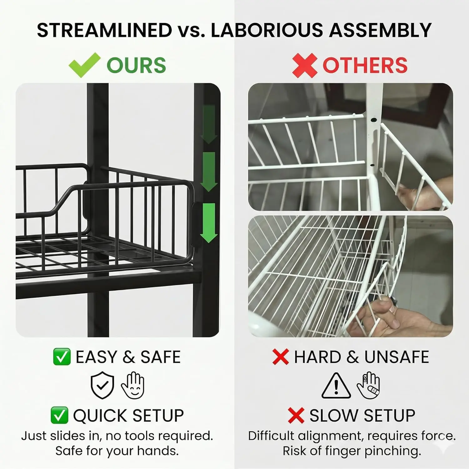 ·FRUSTRATION-FREE SLIDING ASSEMBLY: Ditch the difficult insertion holes that cause pinched fingers. Our commercial wire baskets feature an innovative sliding rail track system, allowing you to seamlessly glide the wire baskets into place. Enjoy a rapid, assemble the entire rack in under 15 minutes that prevents hand injuries and respects your time.
