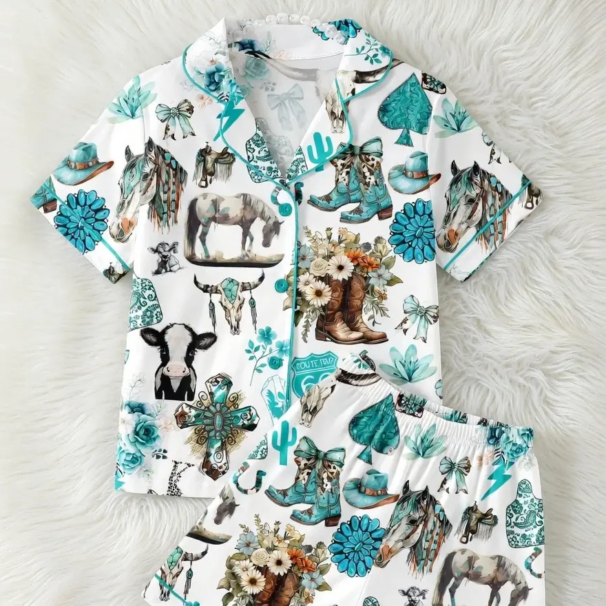 Western Cowgirl Pajama Set, Cowgirl Aesthetic Pajama Satin Set Turquoise Horses, Boots & Cactus Satin Pajamas