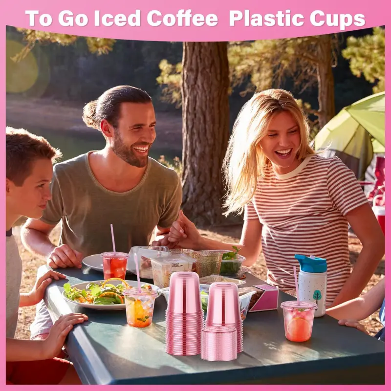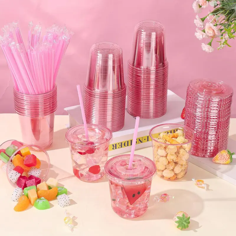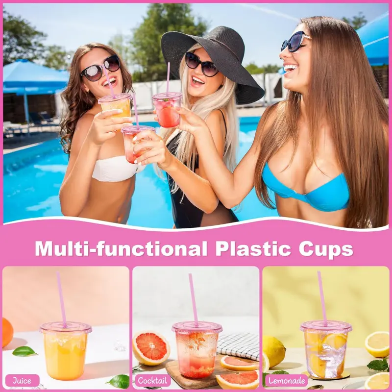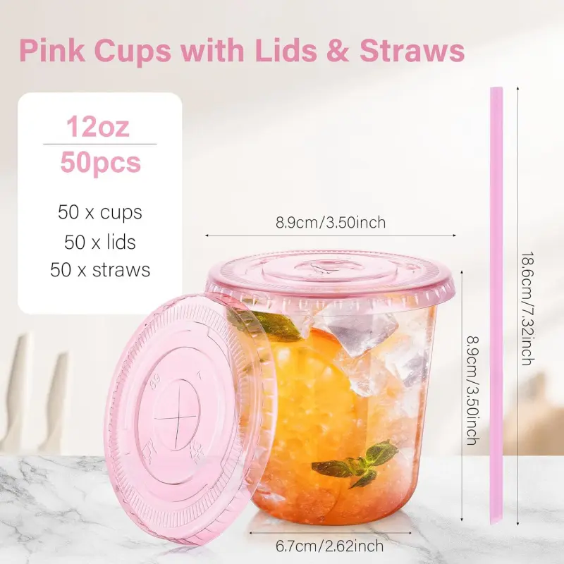 Package Quantity: You will get 50pcs 12oz disposable pink clear plastic cups, 50pcs pink lids and 50pcs pink straws, measuring about 3. 50 x 3. 50 inches, ample quantity is enough for your party or daily use. The pink cup is an ideal choice for iced coffee, lemonade, juices, smoothies, milkshakesPremium Materials: The pink disposable cups with lids are made of PET plastic, no BPA,, odorless, sturdy and not easy to break. These to-go cups are U-shape design so easy to grip, thickened bottom so not easily tipped over, suitable for travel or home use. (Note: These cups cannot hold hot drinks)Leak-proof Lid: The pink disposable iced coffee cup comes with a proper leak-proof lid and straw, the lid fits tightly to the mouth of the cup, so you don't have to worry about spilling your drink while driving or walking. Whether you're at work or travelling, you can take it with you for a quick cup of coffee or beverageClear & Convenient of Life: The pink clear cups with lid and straw allows you to see all kinds of beverages at a glance, providing you with a pleasant drinking experience, which are lightweight and stackable, saving you storage space. In addition, which can be disposed of directly after use, saving time on cleaning and allowing you to enjoy the party to the fullestWide Application: These pink rounded bottom plastic cups with lids and straws can hold coffee, juice, smoothies, milk tea, lemonade, soda, wine, cocktails and a variety of mixed drinks. The pink plastic coffee cups are suitable for picnics, barbecues, coffee shops, pool parties, outings, family gatherings, Thanksgiving, Christmas and all kinds of holidays and events
