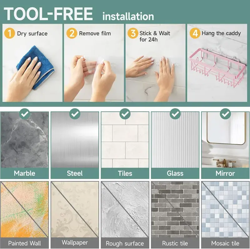 Elevate your bathroom with this stylish 5-Pack set. It includes a rust-proof, waterproof shower caddy, toothbrush holder, and soap holder. No drilling required, making installation a breeze. Perfect for graduation gifts or Mother's Day.