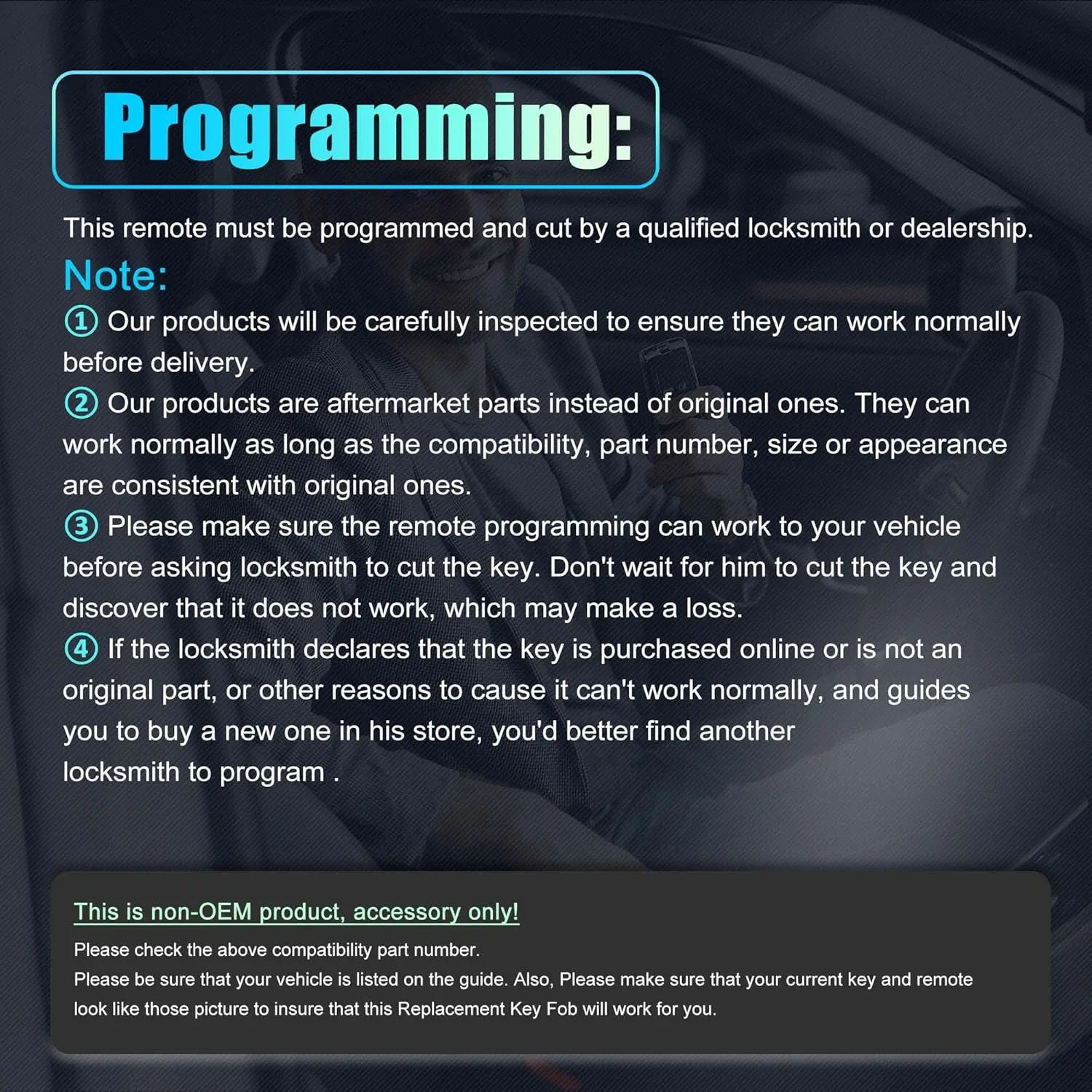 Program by a locksmith or dealership. Fits Chrysler Town & Country, Voyager, Dodge Caravan, Durango, Dakota, Pickup Truck. Not for vehicles with power sliding doors. Ensure programming works before cutting the key. Avoid locksmiths who suggest buying from their store. Replace batteries using a screwdriver tip. Clean the battery area.