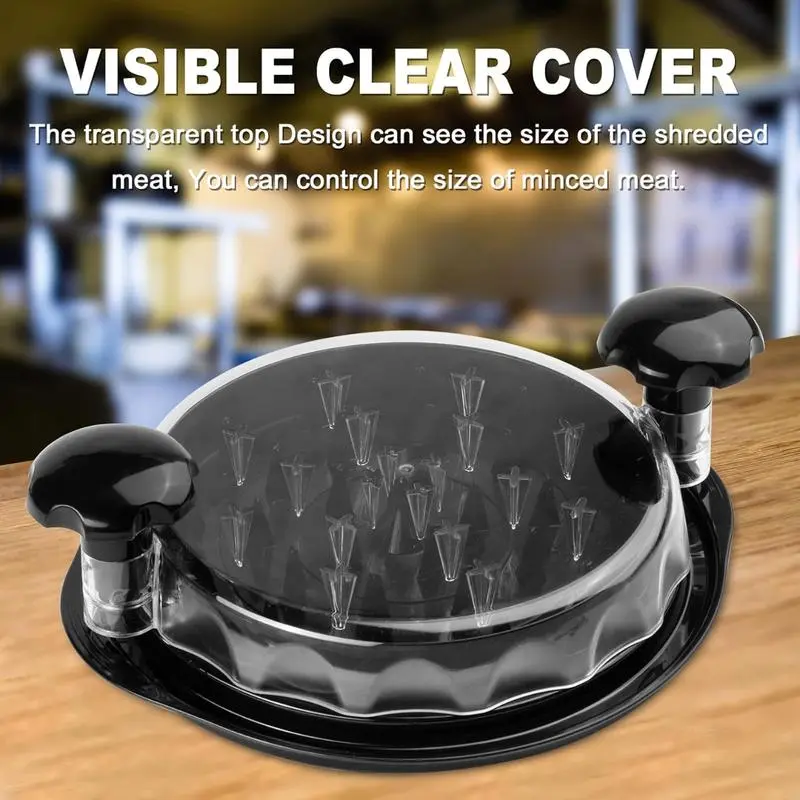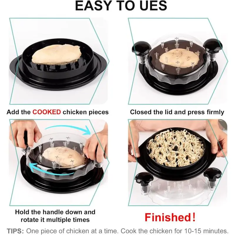 Cook the meat first and cut it into small pieces raw meat is not recommended as it can damage the spikes. Place up to three portions on the food shredder for fine, even results. Twist multiple times for your desired texture. Once shredded, check through the clear lid, then transfer the meat to a bowl and enjoy creating delicious dishes!