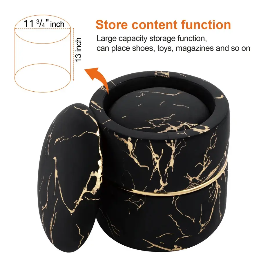 Designed with chic Electroplated Gold in Brush it will impress your friends and family Stable and Comfortable: Upholstered round storage ottoman is Constructed by Solid Wood with Approx. 1. 6"thickness frame; filled with resilient upholstered foam and cover by durable velvet fabric. Padded cushion top with high density foam which is a great way to make your more comfortable