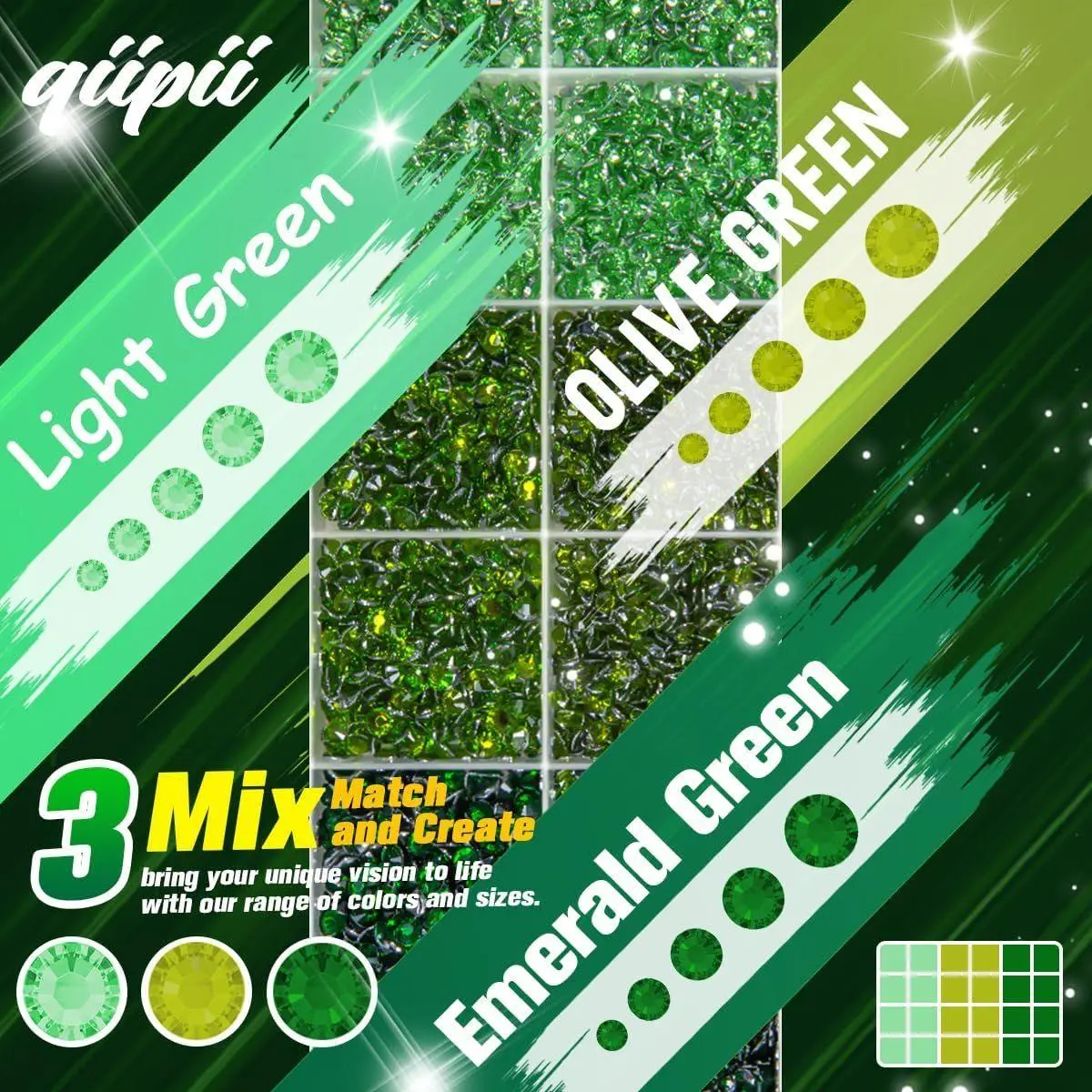 ❤【Abundance for Satisfaction】qiipii is always eager to provide you with more choices and more fun. Love and require the use of a specific hue of Fresh Green or Olive Green? This Crystal Resin Bulk box kit offers 3 colors in this color series, allowing you to easily select the one you prefer. Within the 24 girds, there are 2mm, 3mm, 4mm,5mm and 6mm Crystal Resin Rhinestones, 5 available sizes offer a greater array of design options, enabling you to fully satisfy your design needs and create more possibilities.