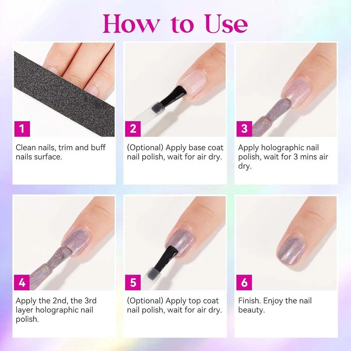 Easy Application and Salon Quality: With proper application, the iridescent nail polish can last 7+ days. Easy to use, with good toughness and tinting strength. Brings you a shine finish and smooth appearance. Suggest to use with base and top coat nail polish to get longer lasting.