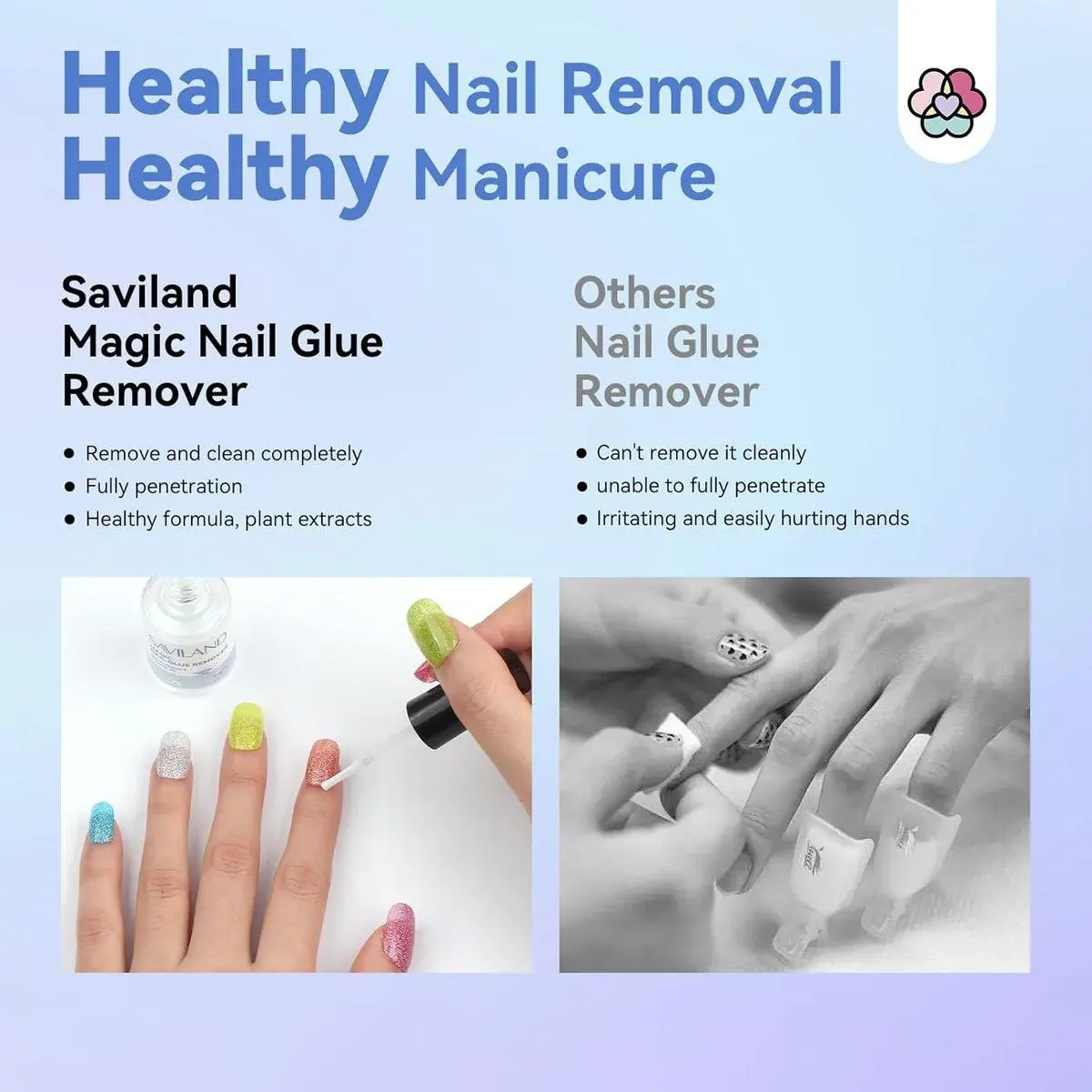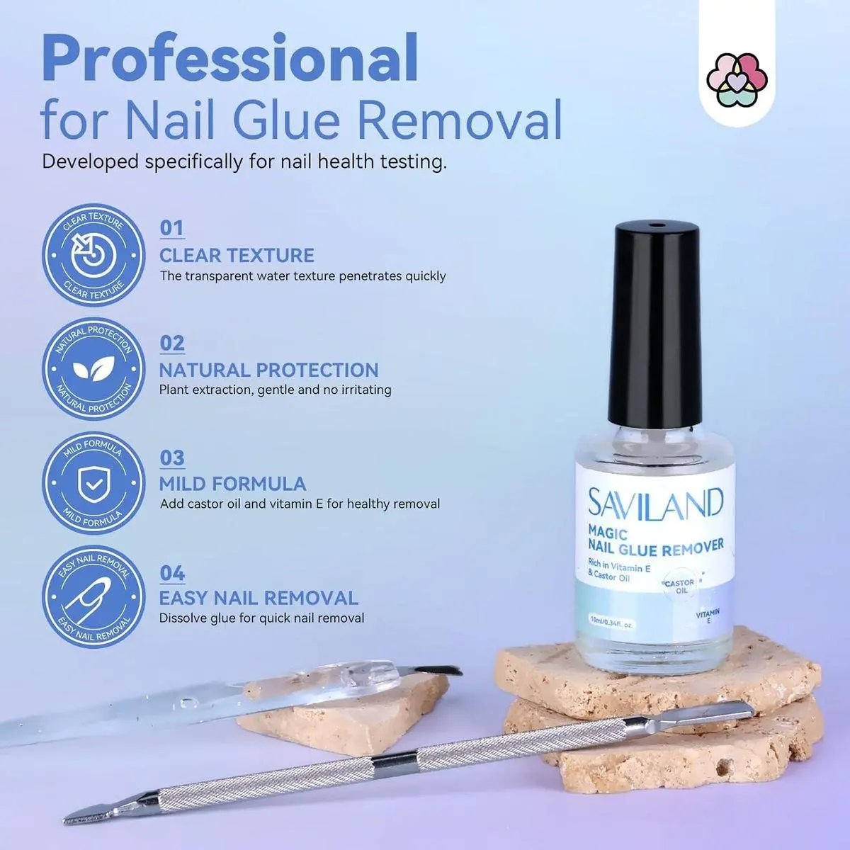 Rich in Castor Oil & Vitamin E: SAVILAND nail glue remover for glue on nails with gentile healthy formula. Specially added plant-based extraction 10% castor oil & 5‰ vitamin E, castor oil moisturize and replenish moisture and prevent dryness that can occur from frequent use of nail glue. Vitamin E offers added protection and nourishment to the nails, allowing them to maintain their strength and health
