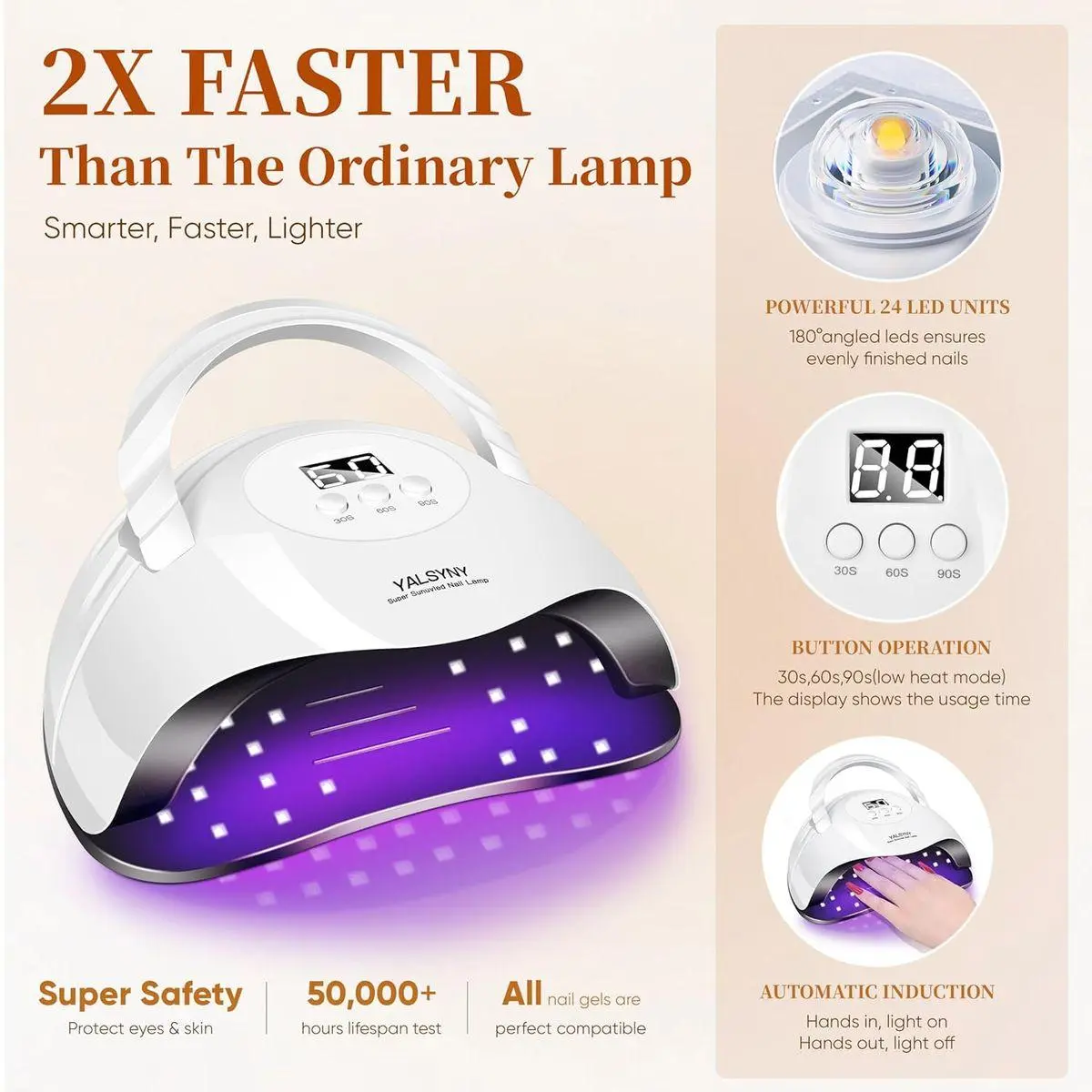 Nail Lamp: Ultra-fast drying U V light LED nail dryer with 3 timer setting auto sensor for fingernail, The LED screen display shows the usage time. High-quality 24psc LED beads, Suitable for almost all nail gels.