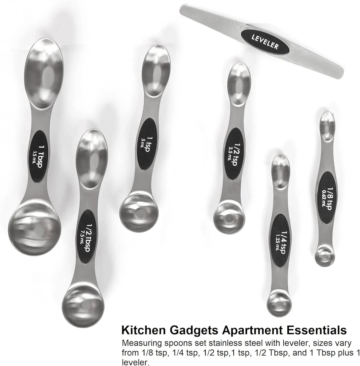 ·Kitchen Utensils Accurate Measuring Spoons Set: Designed with seven stainless steel double-headed spoons set and a leveler, the black plastic label on the magnetic measuring spoons set stainless steel with clear us standard measurement markings is useful for you to cook pastry food or spice jars. This tables gadgets new apartment essentials spoons set is available in various sizes, includes 1/8 tsp, 1/4 tsp,1/2 tsp, 1 tsp, 1/2 tbsp, 1 tbsp plus and 1 leveler.