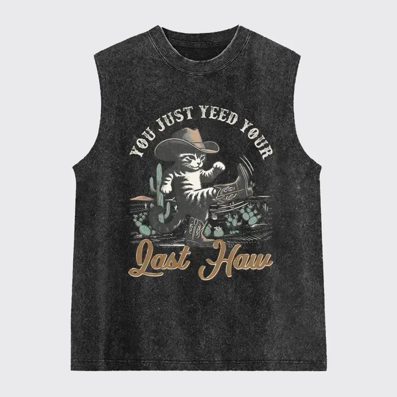 Funny Cat-You Just Yee'd Your Last Haw Washed Tank Top, Gym Essential, Vintage Casual Crewneck Short Sleeves Menswear T-shirt Classic Cotton Fabric Streetwear