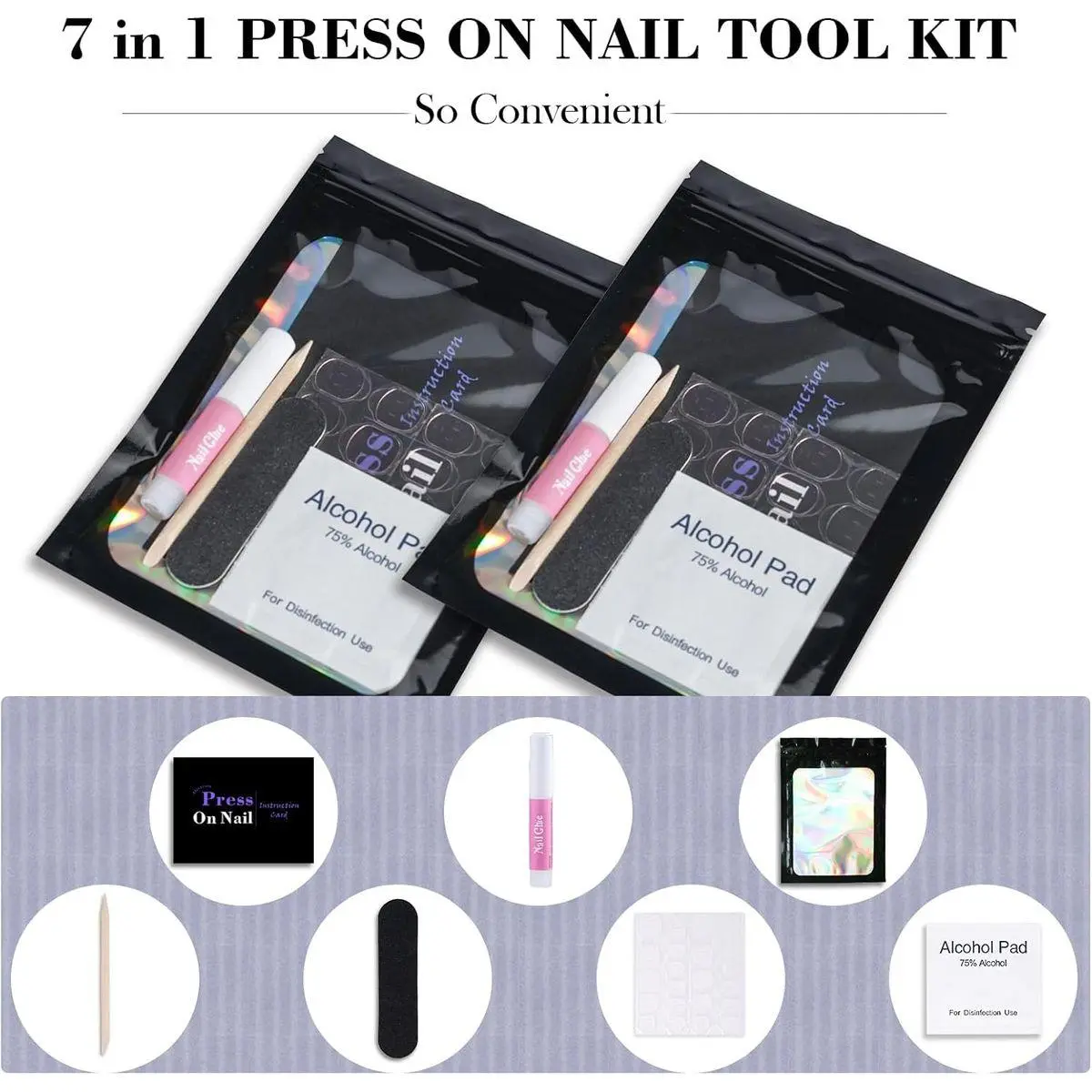 【Disposable 7 in 1 Manicure Kit 】You can use the exquisite holographic bags to store the remaining 6 tools, forming a complete press on nail prep kit. This design is not only stylish and attractive, but also extremely convenient to carry and use.