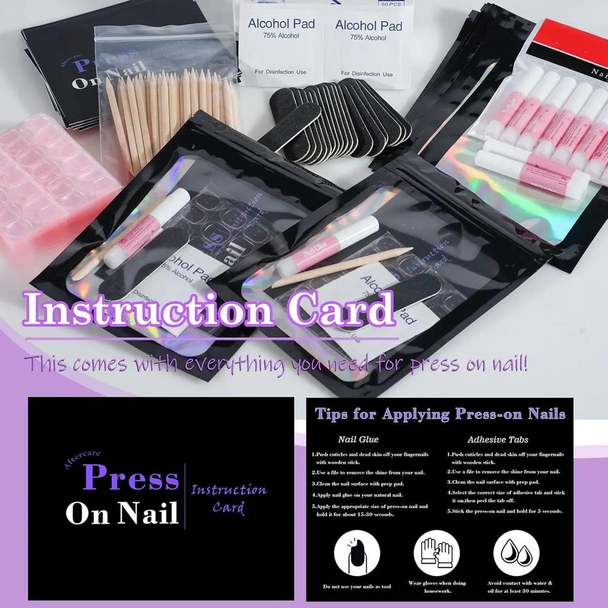 【Package Includes】You will get 20 set of disposable manicure kits(totally 140pcs), including 20pcs Mini nail file,20pcs adhesive tabs,20pcs 2g nail glue,20pcs wood sticks,20pcs prep pads,20pcs holographic bags,20pcs instruction cards