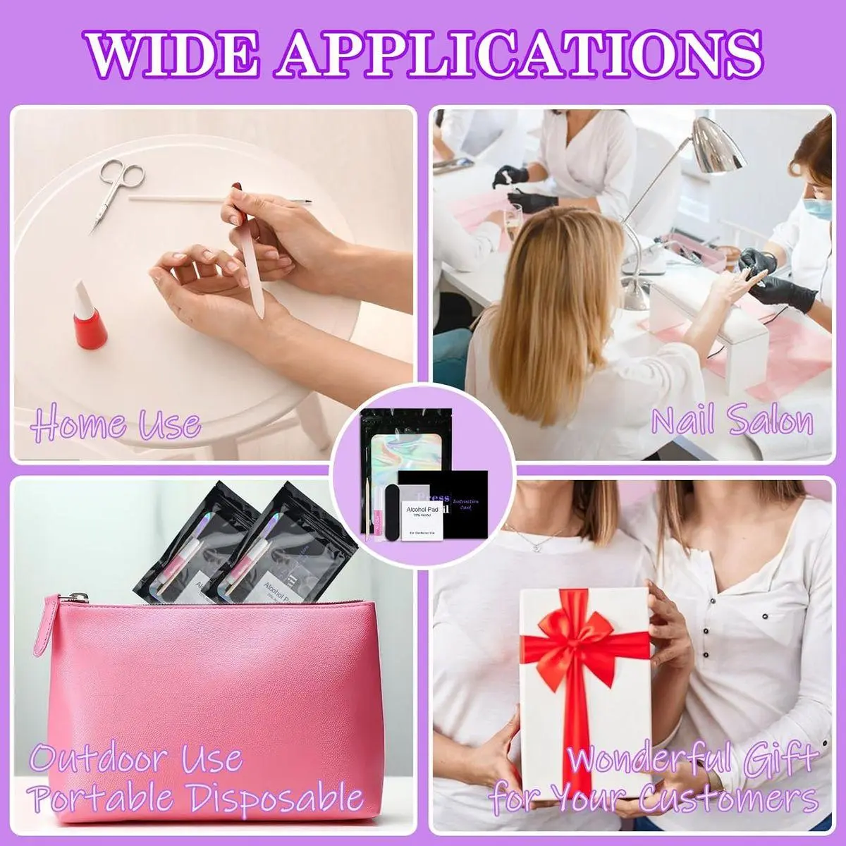 【Wide Applications】These disposable nail kits are suitable for various occasions, including home use, nail salons, and nail training institutions, catering to different scenarios. Whether you are doing your own nails at home, providing services in a professional nail salon, or using them in a nail training course, these kits are up to the task.