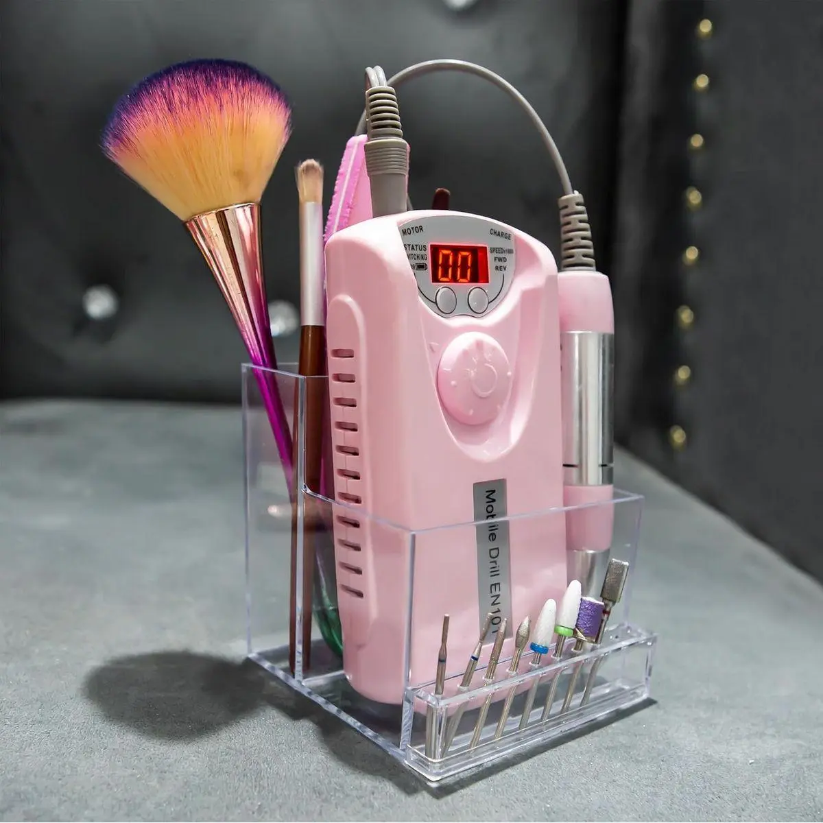 3 Rows from High to Low Design: The highest row features dual-hole storage to display pens and machine plugs. The middle row is for machines. The lowest row has 10 holes for bits, brushes, and makeup tools like eyebrows and eyeshadow pencils. Note: Just an empty holder, others are not included.