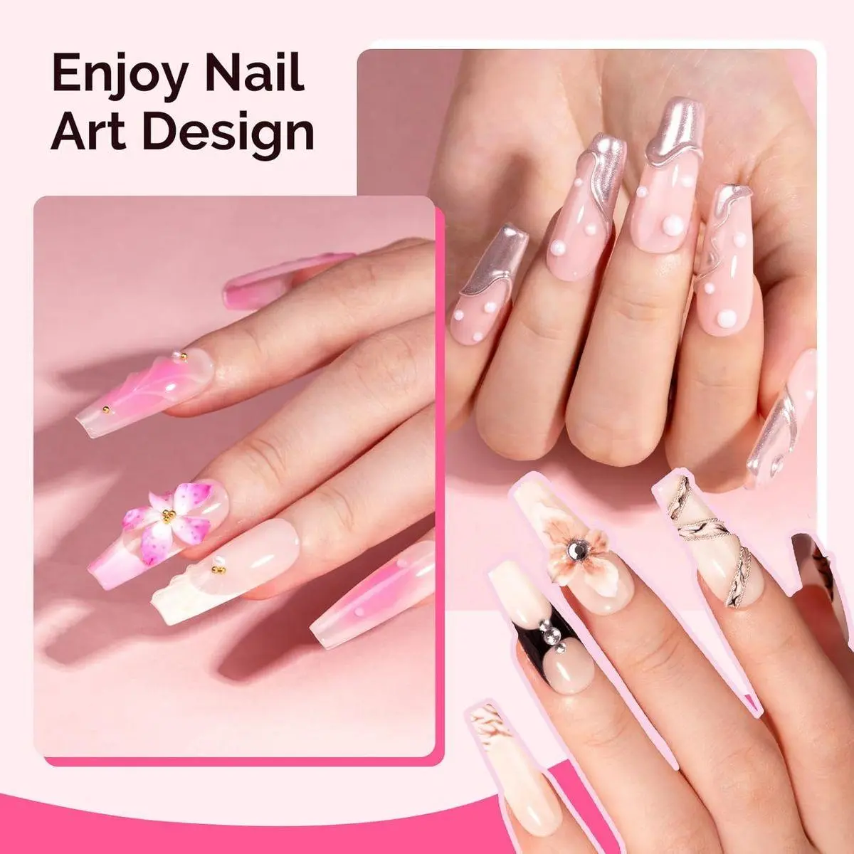 Quick Extension & Easy Carving: Enhanced nails in 3 Easy Step. Take gel with nail form, spread evenly, and cure. It's easy to do 3D nails sculpting, take the soild builder gel for nails shape it into a ball and place it on the nail surface, then shape the pattern with the double-end pen, decorate it, and finish. Required curing.